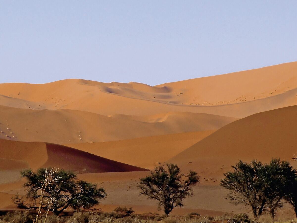 Zum Sonnenaufgang sollten Sie sich auf den Weg zum Eingangstor des Namib Naukluft Parks machen, damit Sie das Farbschauspiel hautnah erleben können. Die Farbschattierungen variieren von blassgelb bis zu leuchtenden Rot- und Orangetönen - halten Sie diese Farben, die im direkten Kontrast zum strahlend blauen Himmel stehen, auf jeden Fall fotografisch fest. Wandern Sie anschließend zum Dead Vlei und besteigen Sie eine der vielen Dünen. Es ist ein großartiges Erlebnis! Im Anschluss bietet sich ein Besuch des Sesriem Canyons an. Ca. 300 km (Frühstück)
