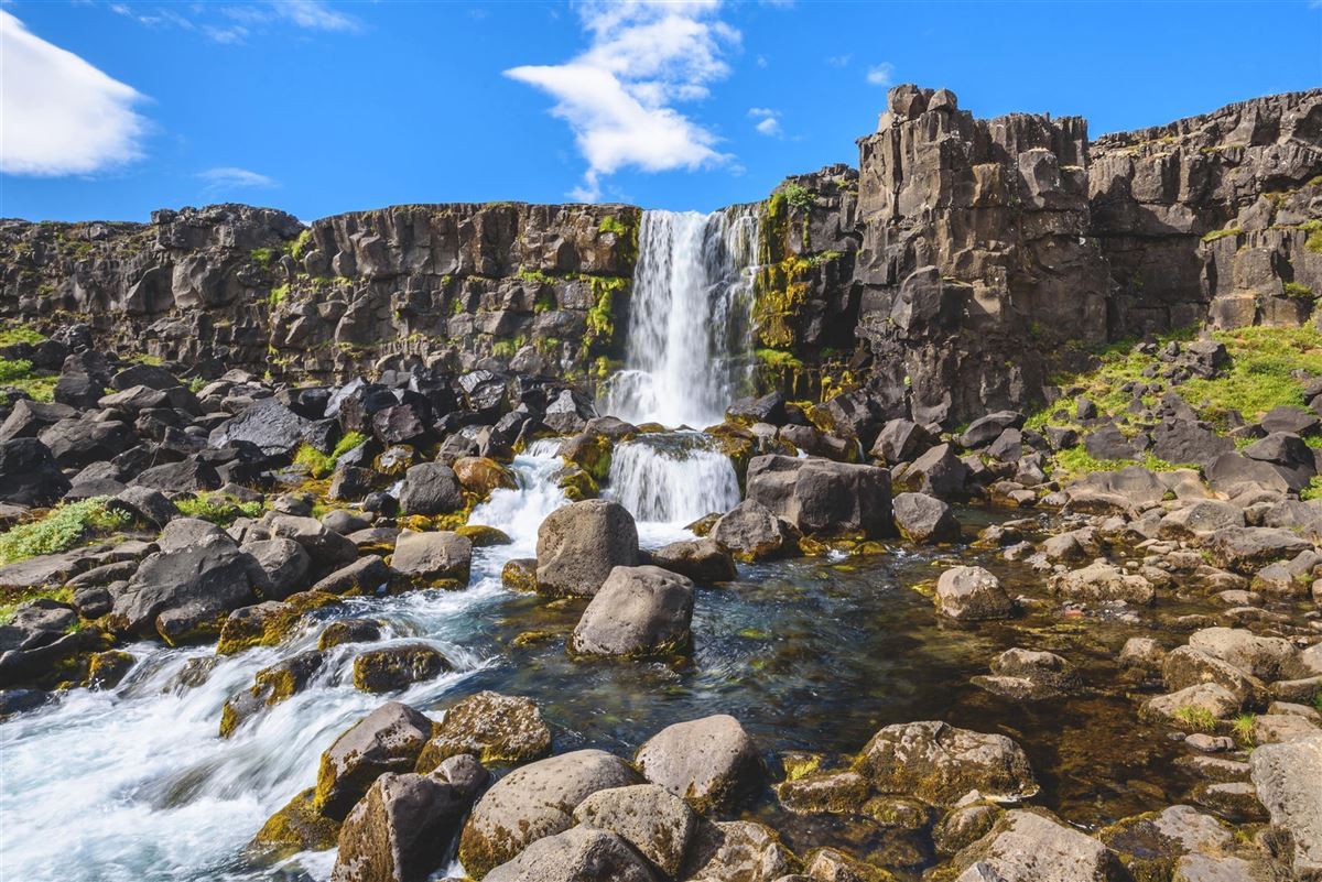 Fahrt über die Hochebene Mosfellsheiði in den Nationalpark Thingvellir, wo 1944 die Republik Island ausgerufen wurde. Weiter zum Gullfoss, dem "goldenen Wasserfall", der stufenförmig in die Schlucht des Flusses Hvítá stürzt. Anschließend Besuch des Geysirgebiets im Tal Haukadalur mit der Springquelle Strokkur, die regelmäßig bis zu 35 m hohe Fontänen ausstößt.