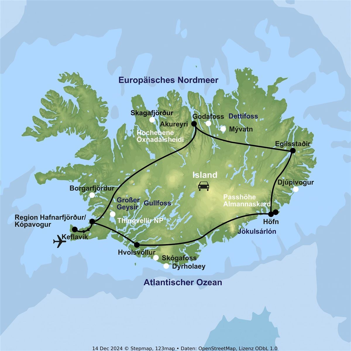 Fahrt von Egilsstaðir nach Norden zum Dettifoss, Europas mächtigstem Wasserfall, der mit 500 m³ Wasser pro Sekunde 44 m tief in die Schlucht stürzt (Straßenzufahrt im Winter witterungsabhängig). Weiter zum Mývatnsee, bekannt für artenreiche Vogelwelt und vielfältige Vegetation. Besuch des Hochtemperaturgebiets Námaskard mit brodelnden Schlammquellen und Solfataren sowie der Pseudokrater bei Skútustaðir. Auf dem Weg nach Akureyri Halt am Godafoss, einem der bekanntesten Wasserfälle des Landes.
