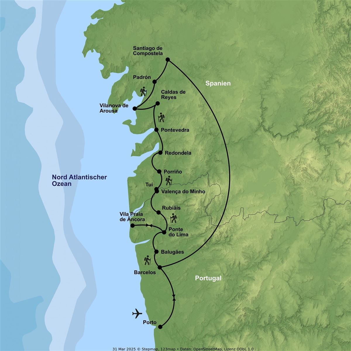 Nach dem Frühstück starten Sie in Ponte de Lima zur Wanderung nach Rubiães (ca. 19km). Die Route führt durch hügeliges, grünes Gelände und über den Alto da Portela Grande - einen Anstieg, der Pilger schon im Mittelalter forderte. Unterwegs passieren Sie das Kreuz der Franzosen und folgen teils noch römischen Pfaden. Nach Ankunft in Rubiães bleibt Zeit für ein individuelles Mittagessen. Anschließend Fahrt nach Valença. Die Festungsstadt mit ihren imposanten Mauern zählt zu den eindrucksvollsten Wehrbauten der iberischen Halbinsel und ist bis heute ein lebendiger Treffpunkt vieler Kulturen.