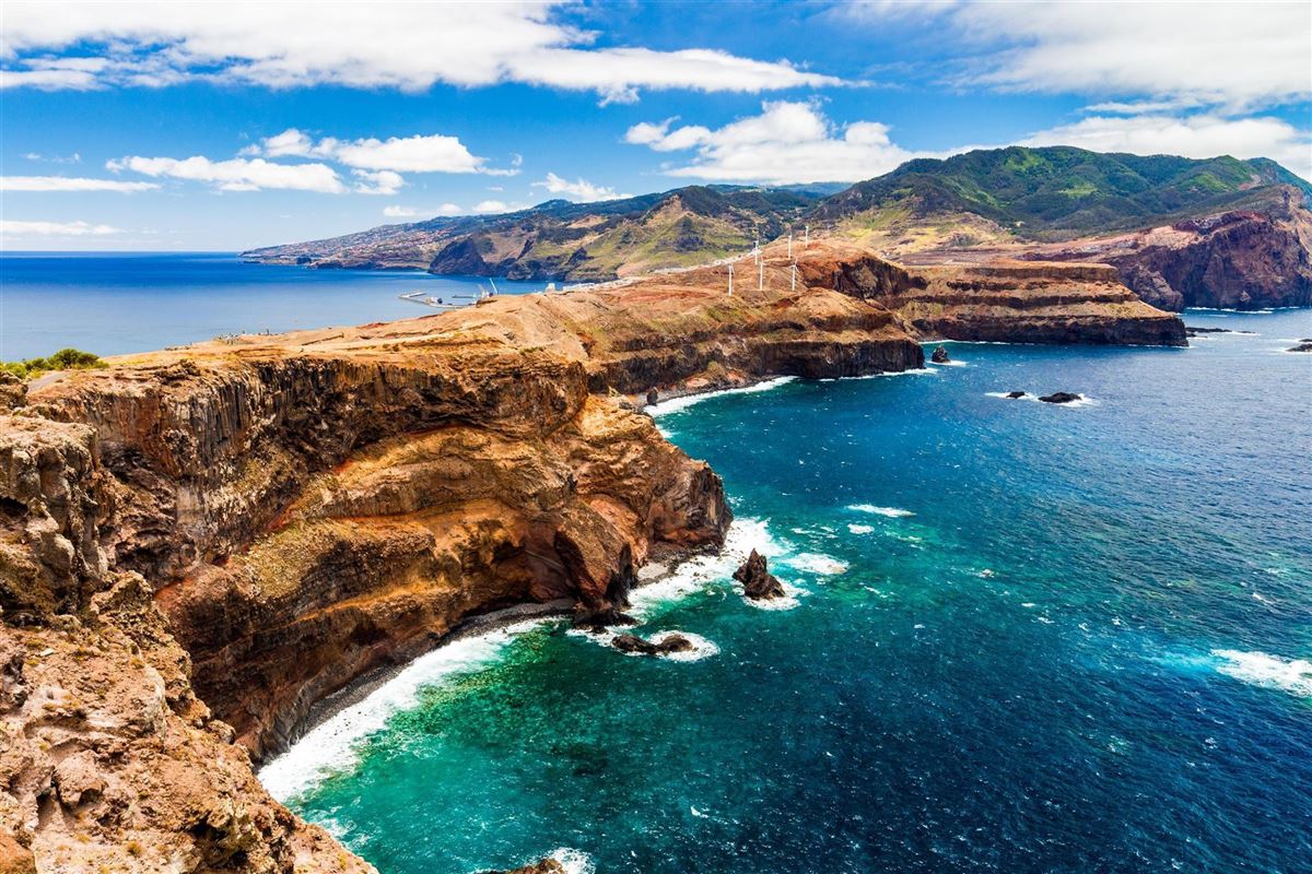 Wanderung entlang der Nordküste über den Sattel Boca do Risco auf einem alten Versorgungsweg mit Blick auf die steilen Küsten und Terrassenfelder. Rückkehr nach Porto da Cruz mit Aussicht auf Meer und Steilküste.