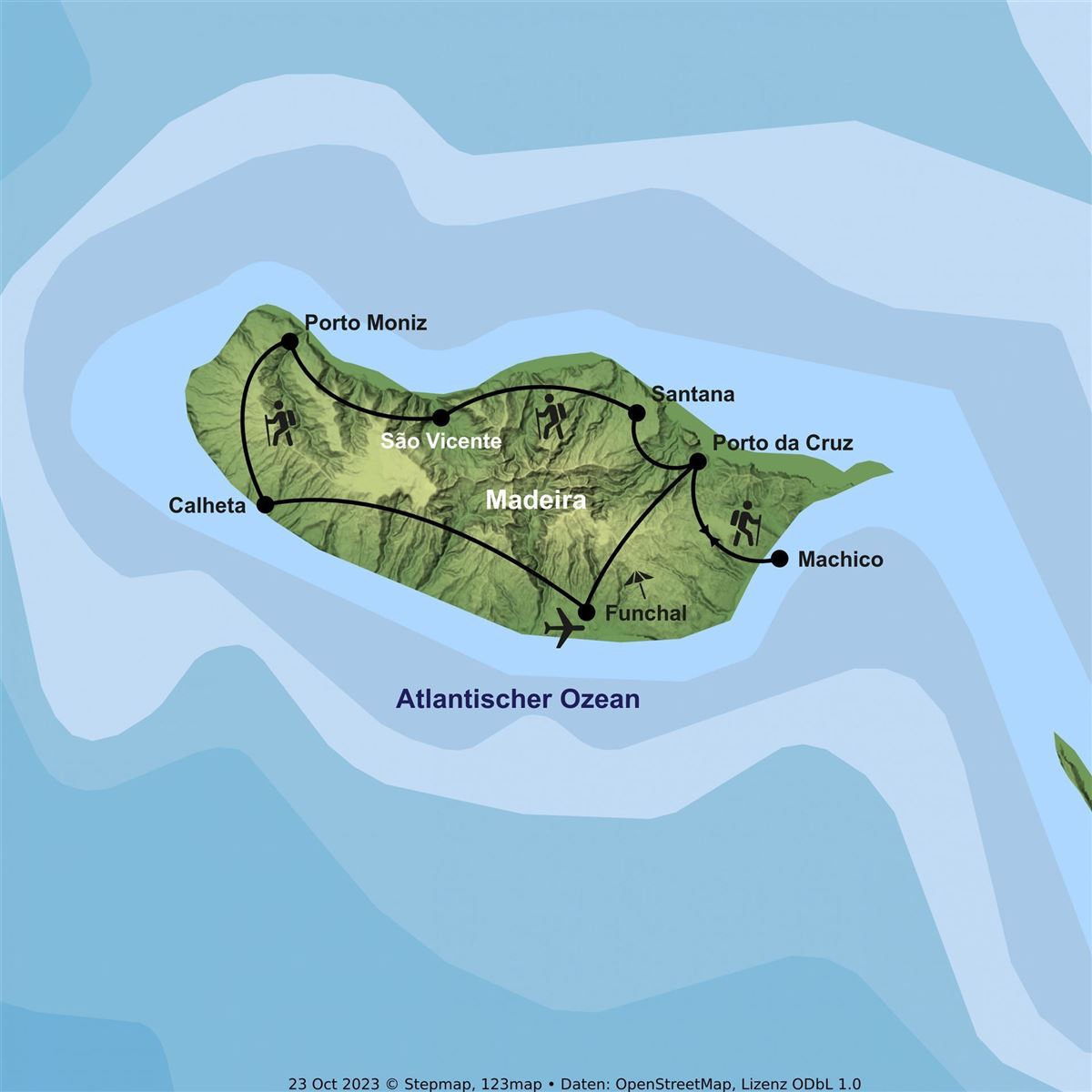 Wanderung entlang der Südwestküste über Hügel und durch kleine Dörfer. In Prazeres Einblick in das ländliche Leben. Die Route führt durch Eukalyptuswald mit Callas, Amaryllis und Agapanthus. Übernachtung in Calheta mit Sandstrand und Yachthafen.