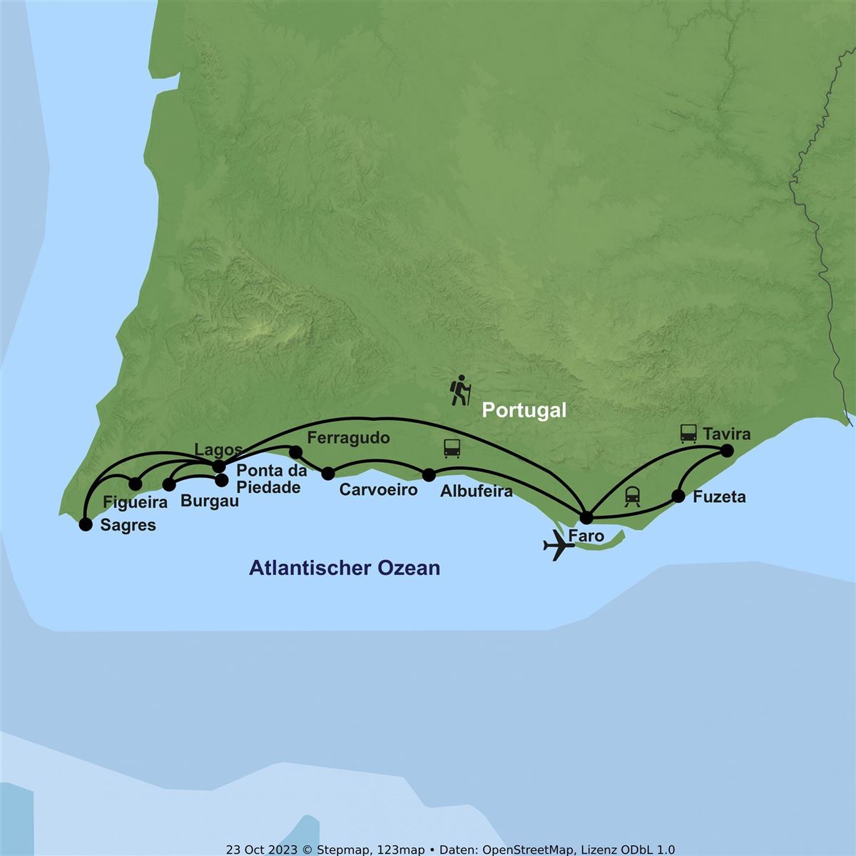 Schwarze, rote und gelbe Felsformationen, karge Hochflächen, Sandstrände und Landzungen prägen die Wanderkulisse. Von Sagres aus führen Pfade entlang der Westküste durch die Macchia. Über Steige und durch Buchten geht es weiter bis zum Dorf Figueira.