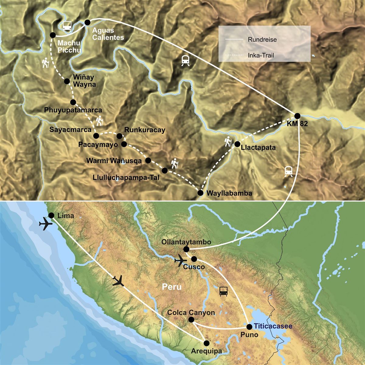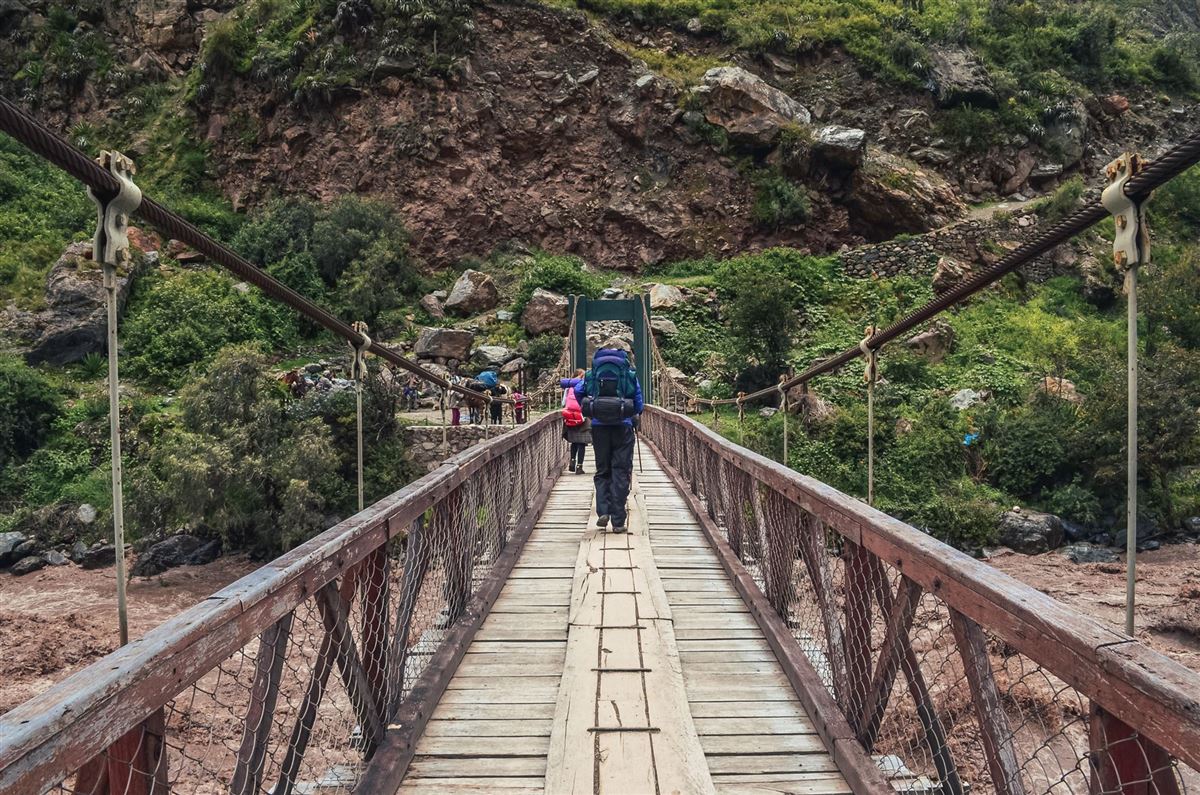 Frühmorgens Fahrt durch das Heilige Tal bis Kilometer 82 der Machu-Picchu-Eisenbahnstrecke. Nach einer kurzen Pause beginnt der viertägige Inka Trail. Über eine Fußgängerbrücke führt der Weg etwa zwei Stunden den Urubamba-Canyon hinab. Entlang der Route liegen imposante Inka-Terrassen und die Siedlung Llactapata am Ufer des Cusichaca-Flusses. Der anschließende Aufstieg durch das Cusichaca-Tal führt nach Wayllabamba, dem letzten bewohnten Dorf des Pfades. Hier befindet sich das Nachtlager.