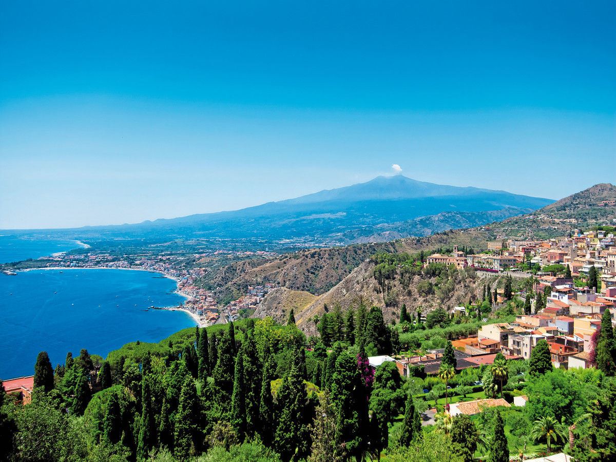 7 Nächte im Raum Taormina (Hotelbeispiele: Albatros Beach Hotel, Hotel Olimpo, Hotel Caesar Palace, Hotel Baia Azzurra (jeweils gehobene Mittelklasse, Landeskategorie: 4 Sterne)).