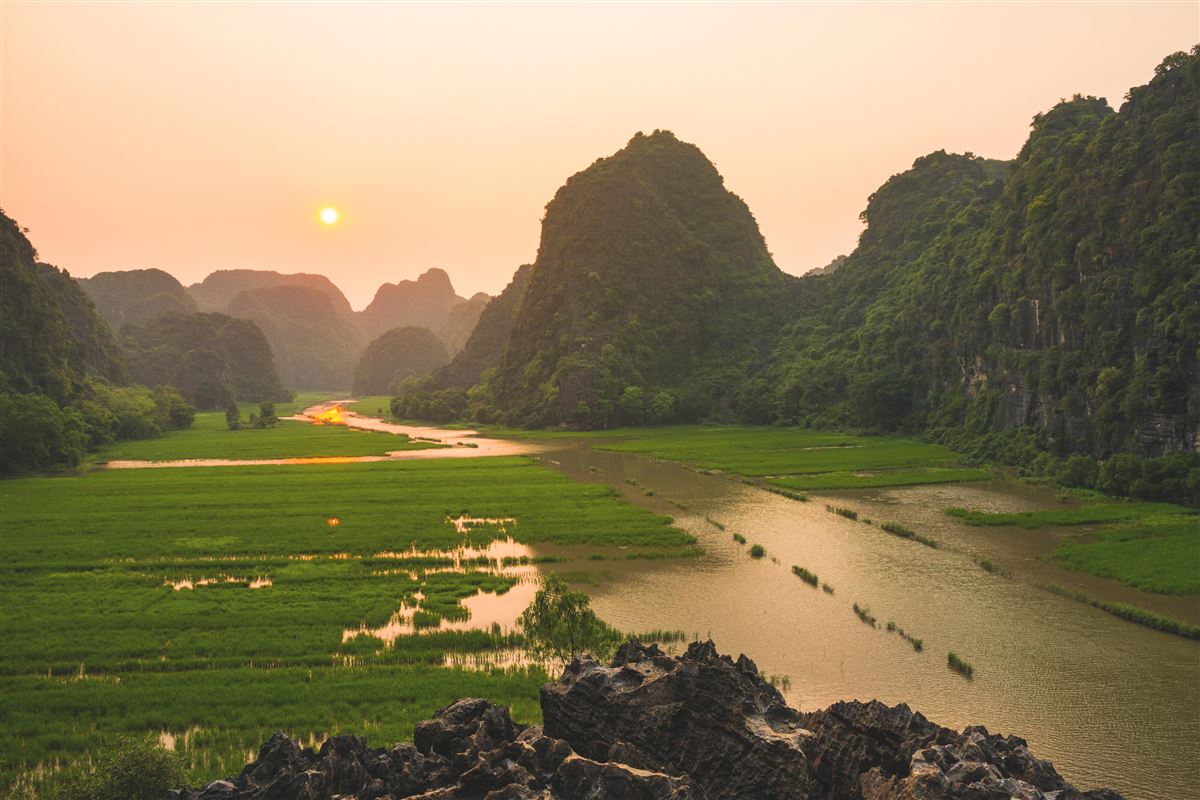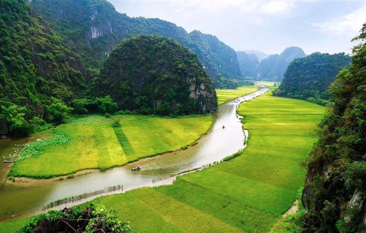 Fahrt nach Ninh Binh mit Besuch der alten Zitadelle von Hoa Lu mit Relikten aus der Dinh- und Le-Dynastie. Bootstour zu den Grotten von Tam Coc, umgeben von Karstformationen.