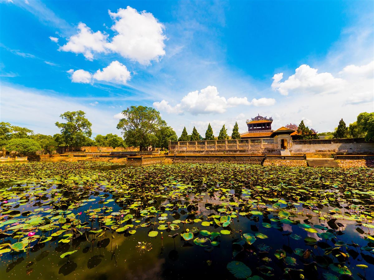 Am Vormittag Besichtigung eines typischen Gartenhauses, das nach den Regeln der Geomantie erbaut wurde und der Thien-Mu-Pagode, ein buddhistisches Kloster am Nordufer des Parfümflusses. Im Anschluss Besuch des Kaisergrabes von Minh Mang und des Dong-Ba-Marktes.