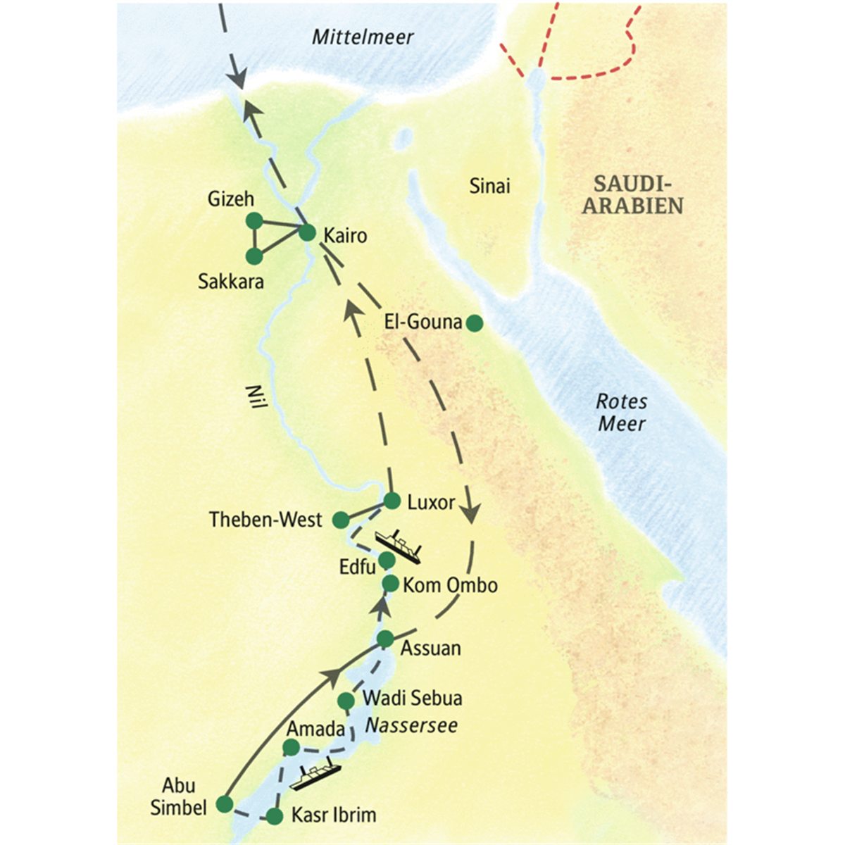 Langsam rücken die kolossalen Statuen näher, die Ramses II. aus dem roten Fels hauen ließ. Abu Simbel - der Tempel der Tempel! Fast wäre das Lebenswerk des Königs im Nassersee versunken – die Geschichte der UNESCO-Rettungsaktion klingt spannend wie ein Thriller! Am Nachmittag bestimmen Sie das Programm. Wer mag, erlebt den Ramses-Tempel abends noch einmal bei der Ton- und Lichtshow.