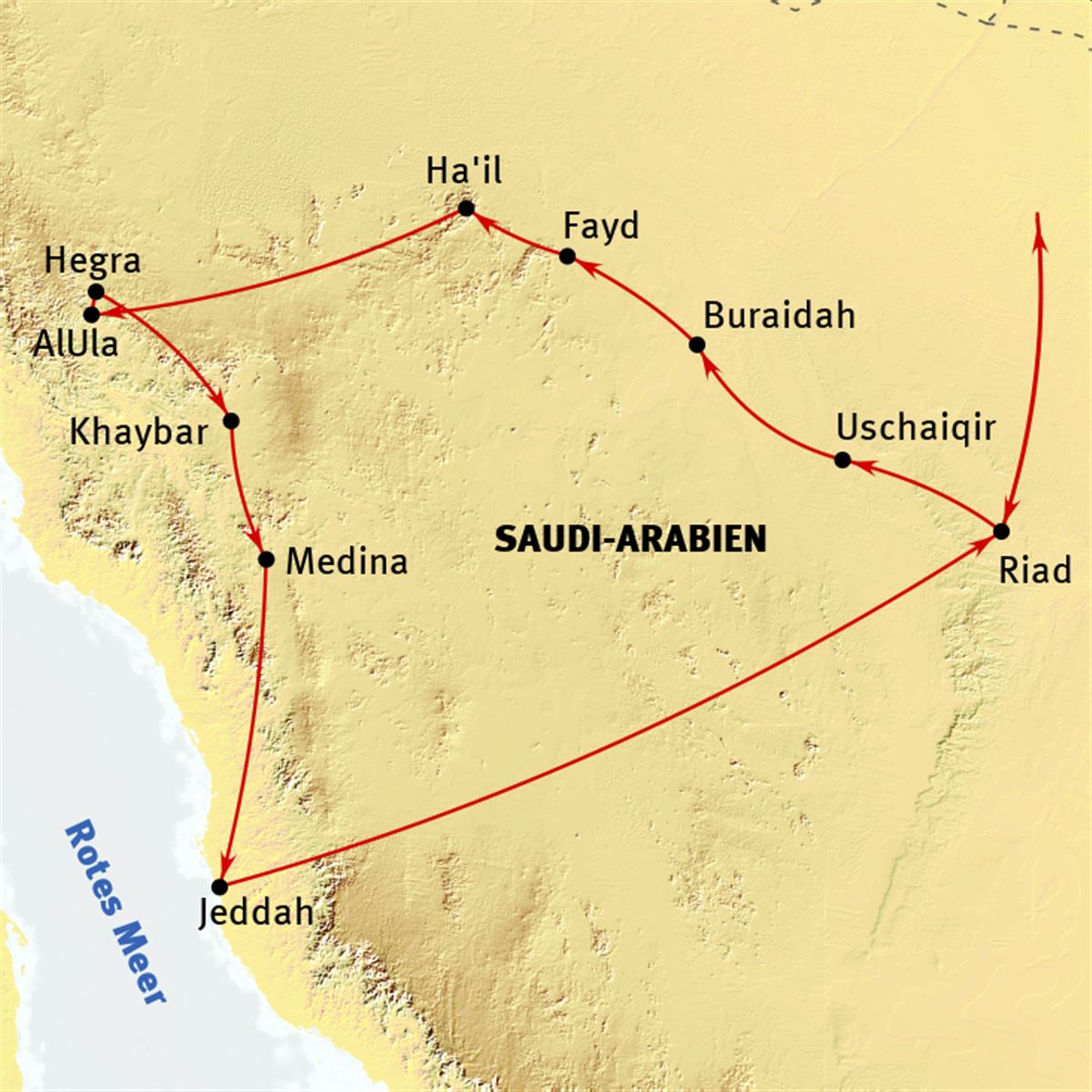 Frühmorgens erleben wir das geschäftige Treiben auf einem der größten Kamelmärkte der Welt. Im Museum erfahren wir danach Wissenswertes zur Geschichte von Buraidah und sehen Gegenstände, Kunstwerke und Oldtimer, die König Abdul-Aziz gehörten. In Fayd schauen wir das Museum und die archäologische Stätte aus vorislamischer und islamischer Zeit mit ehemaliger Festung und Zisternen an. Auch Fayd lebte von den Karawanen, Pilgern und Händlern, die zwischen Bagdad und Mekka unterwegs waren. Abends erreichen wir Ha´il. (290 km, 3 h)