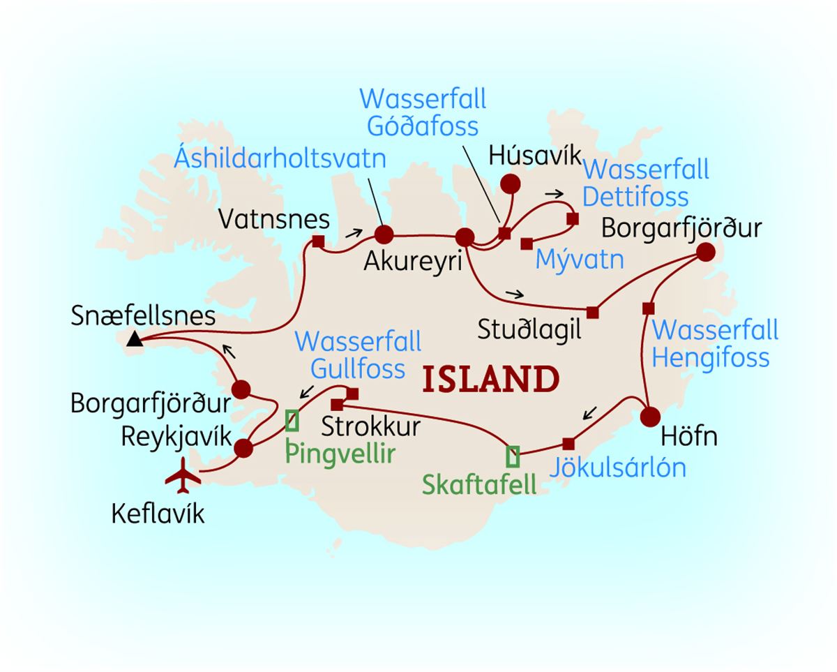Zum Abschluss werden heute die prominentesten Sehenswürdigkeiten Islands besucht: bestaunen Sie im Hochtemperaturgebiet Haukadalur den imposanten Geysir Strokkur mit seiner bis zu 20 Meter hohen Wasserfontäne. In der Nähe stürzt der „Goldene Wasserfall“ Gullfoss in zwei Kaskaden in eine 70 Meter tiefe Schlucht. Die Rückfahrt nach Reykjavík führt durch den Nationalpark Þingvellir (UNESCO Weltkulturerbe). Ein besonderes Highlight in diesem Park ist die Talsenke, die von der Spalte Almannagjá durchzogen ist. Genießen Sie eine Wanderung durch diese faszinierende Landschaft (leicht, 3 km, ca. 1,5 Std., +/- 50 Hm). 1 Nacht im Raum Reykjavík. (F)