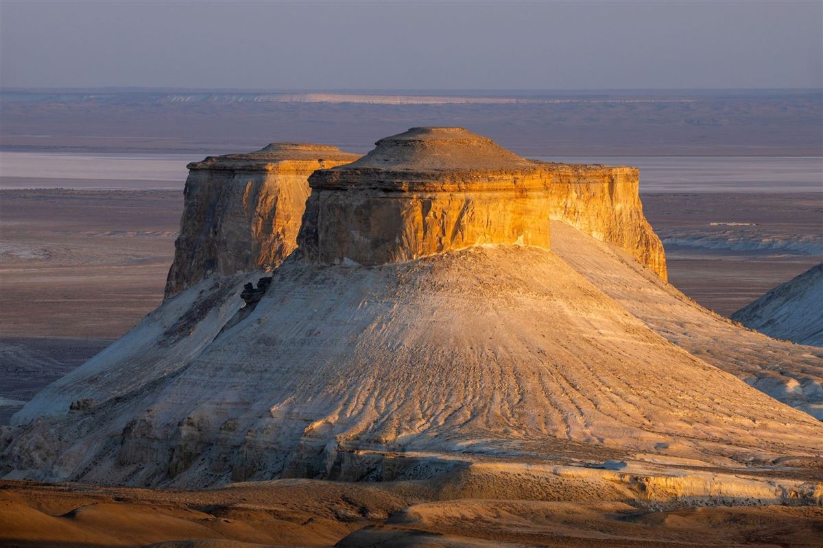 Am Morgen verlassen Sie Aktau und erkunden die Region Mangystau. Eine der spannendsten Exkursionen der gesamten Reise. Karagiye ist eine einzigartige Naturattraktion im Südwesten Kasachstans. Mit 132 Metern unter dem Meeresspiegel befinden Sie sich am fünfttiefsten Ort der Welt und am tiefsten Punkt Kasachstans. Die Karagiye-Senke ist beachtliche 40 km lang und erstreckt sich entlang des Kaspischen Meeres.Später fahren Sie zu den malerischen Hügeln von Kyzylkup, von den Einheimischen wegen seiner gestreiften farbigen Linien auch Tiramisu genannt. Dort unternehmen Sie eine kleine Wanderung und bewundern den beeindruckenden Berg Bokty. Anschließend setzen Sie Ihre Reise fort ins Bozzhira-Tal, wo Sie Ihr Lager am Abend aufschlagen und Ihr Abendessen unter freiem Himmel genießen. Übernachtung im Zelt. (Fahrzeit ca. 6-7h, 320 km).