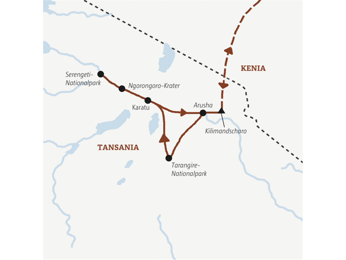 Löwen jagen im Affenzahn eine Gazelle. Elefanten baden trompetend im Fluss. Eine Herde Zebras grast neben unserem Geländewagen. Solche Momente machen diesen Safaritrip in kleiner Gruppe unvergesslich! Wir besuchen die schönsten Nationalparks in Tansania: die Serengeti, den Ngorongoro-Krater und Tarangire. Immer auf den Spuren der Big Five. Dazwischen Nächte im Zeltcamp, Fahrradtour zur Kaffeeplantage, Blicke auf den Kilimandscharo und Zeit zum Relaxen.