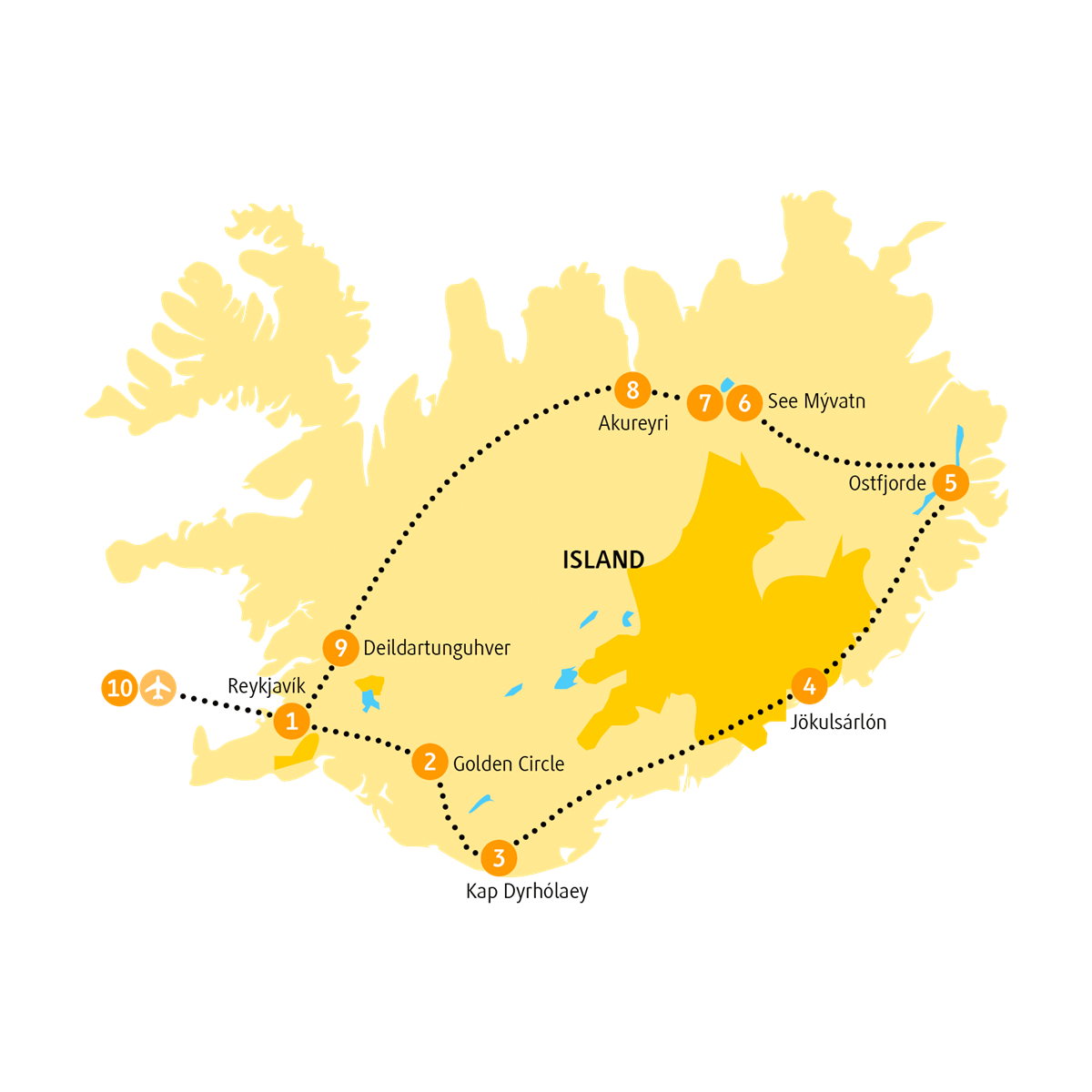 Die Aufregung steigt, denn nun lernst du deine Gruppe und die Reiseleitung kennen, die dich quer durch Island mit all seinen Farben und Facetten begleiten. Nach einer Stärkung geht es auch schon los, um die am dünnsten besiedelte Insel Europas zu erkunden. Du wirst erstaunt sein, wie vielfältig die Landschaft hier durch Naturkontraste wie Vulkane, heiße Quellen, Geysire und grüne Wiesen geprägt ist. Mit dem Staunen geht es direkt los und es wird in den kommenden Tagen auch nicht aufhören. Versprochen! Du fährst heute zum einzigen UNESCO-Weltkulturerbe des Landes, den Thingvellir-Nationalpark. Hier kam zu Zeiten der Wikinger das erste isländische Parlament Althing inmitten einer imposanten Felskulisse zusammen. Die beschlossenen Gesetze wurden anschließend auf dem Lögberg verlesen. Doch auch die Natur hat hier einiges zu bieten. Kommt dir die Landschaft bekannt vor? Wenn ja, dann hast du bestimmt Game of Thrones oder einen der vielen anderen Filme, die hier gedreht wurden, gesehen. Halte deine Kamera bereit für die beeindruckende Allmännerschlucht. Hier siehst du die Auswirkung des Auseinanderdriftens der Nordamerikanischen und der Eurasischen Felsplatten. Anschließend fährst du weiter auf dem sogenannten »Golden Circle« zum zuverlässig ausbrechenden Geysir Strokkur und zum eindrucksvollen Wasserfall Gullfoss. Anschließend besuchst du eine Milchfarm, die von vier Geschwistern bereits in siebter Generation betrieben wird. Hier wirst du mit traditionellen Spezialitäten aus hofeigenen Produkten verwöhnt. Verpasse bloß nicht den frischen Skyr und die himmlische Eiscreme.