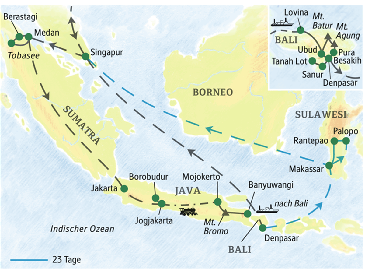 Die Insel Samosir erkunden wir vom Boot aus und rätseln über die Steinsitze von Ambarita. An gestrandete Schiffe erinnern die Dachfirste der Batak-Häuser - ob deren Bewohner den Zauberstab, den wir im Museum sehen, noch ab und zu benutzen? In Tomok besuchen wir dann die Steinsarkophage der Königsfamilie. Lust auf ein Bad im See am freien Nachmittag? Nach einem indonesischen Abendessen im Hotel schmettern Batak-Musiker aus voller Kehle nur für uns Ohrwürmer, die im ganzen Archipel berühmt sind. Was drücken die Lieder aus? Das und mehr besprechen wir spätestens beim Dessert mit den Sängern.