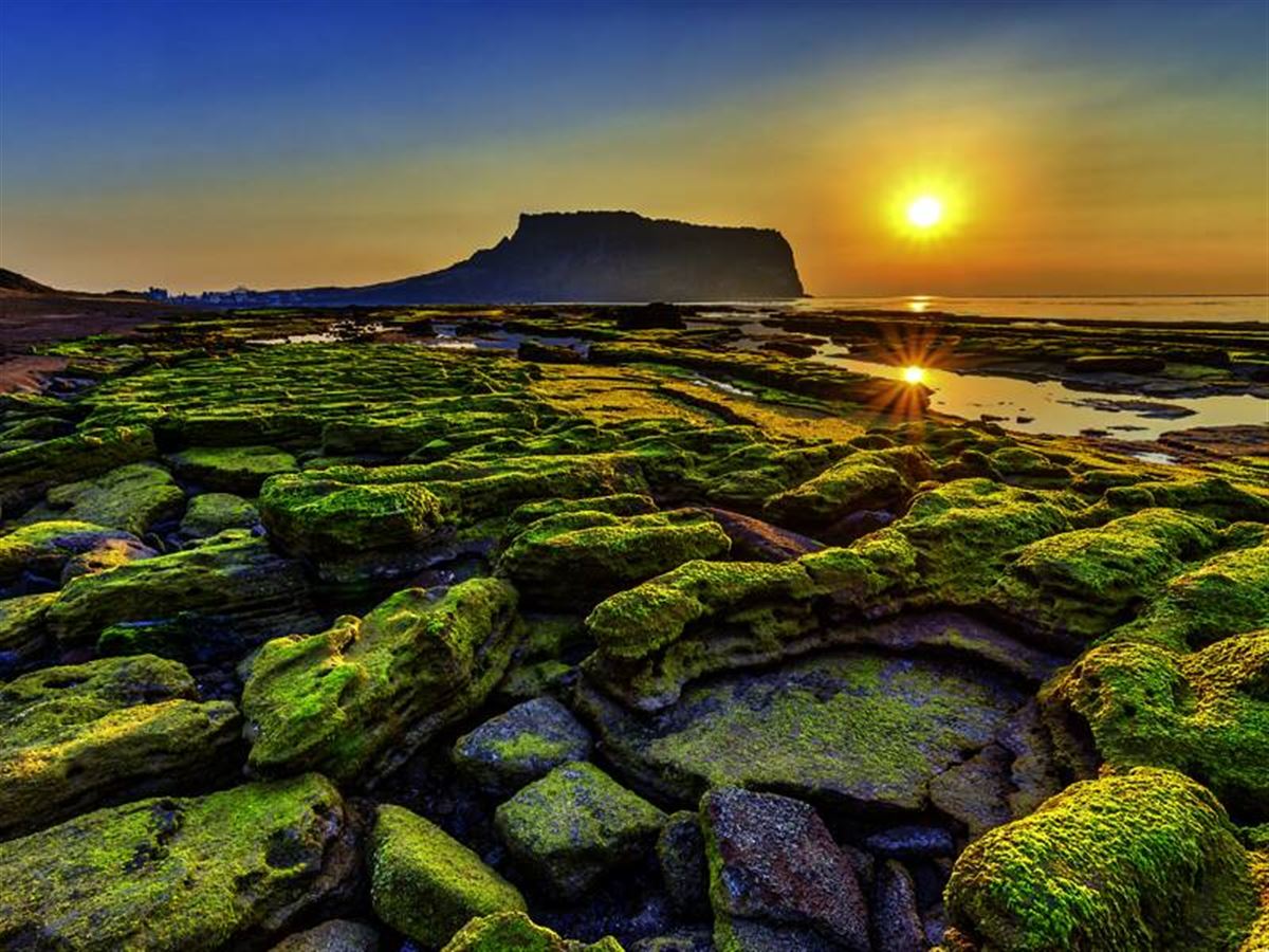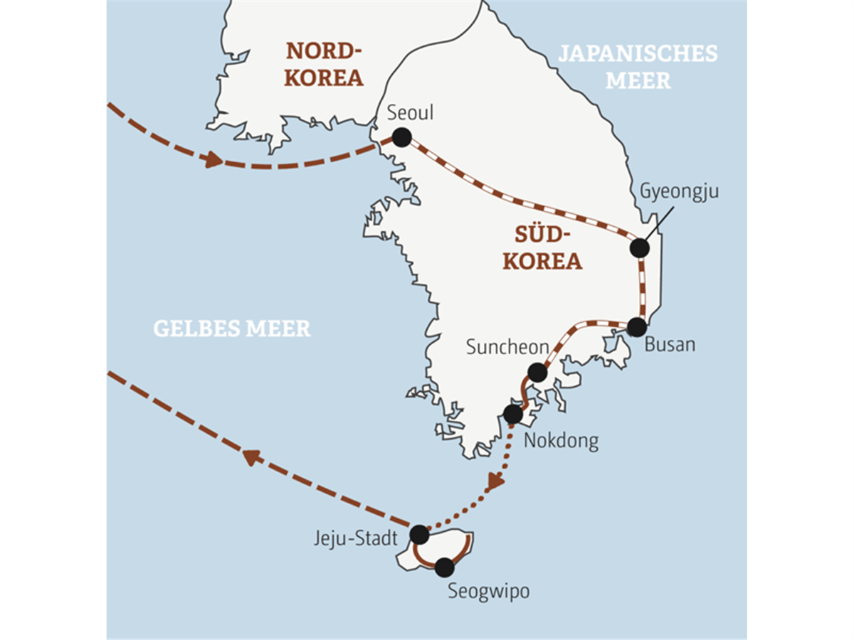 Eine kurze Busfahrt, und schon taucht der steil aus dem Meer aufragende Sunrise Peak vor uns auf, Jejus markanteste Vulkanformation. Über Treppen zum Blick über die sattgrüne Caldera hinweg auf die Weiten des Pazifiks - grandios! Nebenan ist die Basis der Seefrauen: Seit Jahrhunderten holen sie im Freediving Meeresfrüchte wie Abalonen aus der Tiefe. Nachwuchsmangel bedroht akut diese Tradition, vielleicht sehen wir von Weitem eine der toughen Seniorinnen im Wasser. Um die einzigartige Inselkultur geht es auch in einem Museumsdorf, bevor wir unsere Runde am aussichtsreichen Sangumburi-Krater beschließen. Abends locken die nahen Bars von Seogwipo.