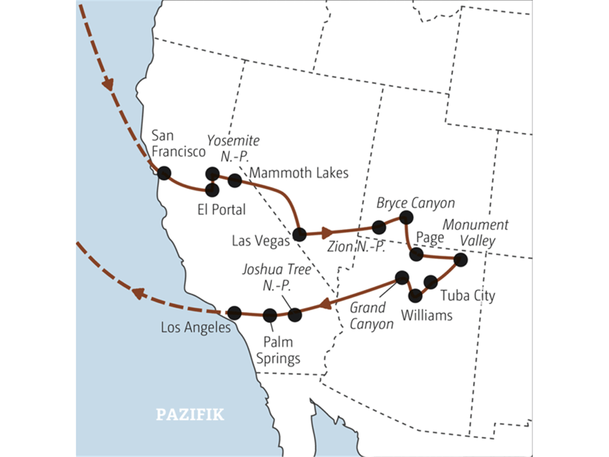 Früher Aufbruch ins Land der durstigen Kehlen - immer kahler wird die Landschaft, immer weiter geht's bergab, bis wir mittendrin sind im Death Valley. Das Tal des Todes hält gleich mehrere US-Rekorde: Es ist die tiefste, die trockenste und außerdem auch noch die heißeste Region des Landes (bei Temperaturen über 40°C besuchen wir zum Schutz der Gesundheit alternativ die Geisterstadt Rhyolite). Weiter geht's nach Nevada, und am späten Nachmittag tauchen sie dann vor uns auf - nein, es ist keine Fata Morgana: Eiffelturm, Sphinx und Freiheitsstatue mitten im Wüstensand! Welcome to Las Vegas! Abends auf eigene Faust durch die Casinos ziehen und sich einfach treiben lassen. Ein Must-see: die Bellagio Fountains – auch bei 30 Grad im Schatten Gänsehaut garantiert!