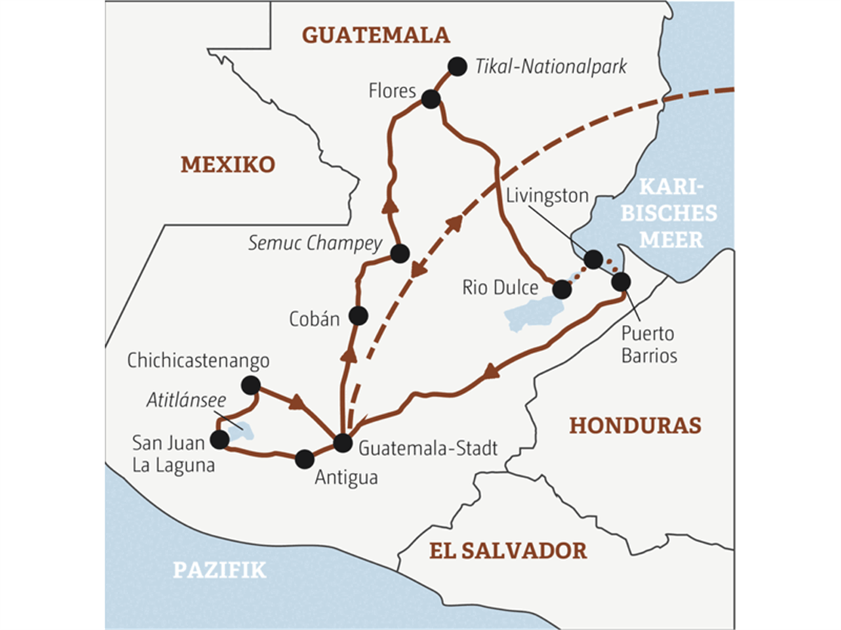 Heute wird's unterirdisch: Die Cuevas de Candelaria sind das größte Höhlensystem Lateinamerikas. Für die Mayas Eingang zur Unterwelt Xibalbá, für uns zu einer himmlischen Höhlentour! Wem das nicht aufregend genug ist, der erkundet das Ganze vom Reifen aus beim Cave Tubing! Solo oder so: Zusammen fahren wir anschließend weiter nach Flores, Tor zu Guatemalas berühmtesten Mayastätten.