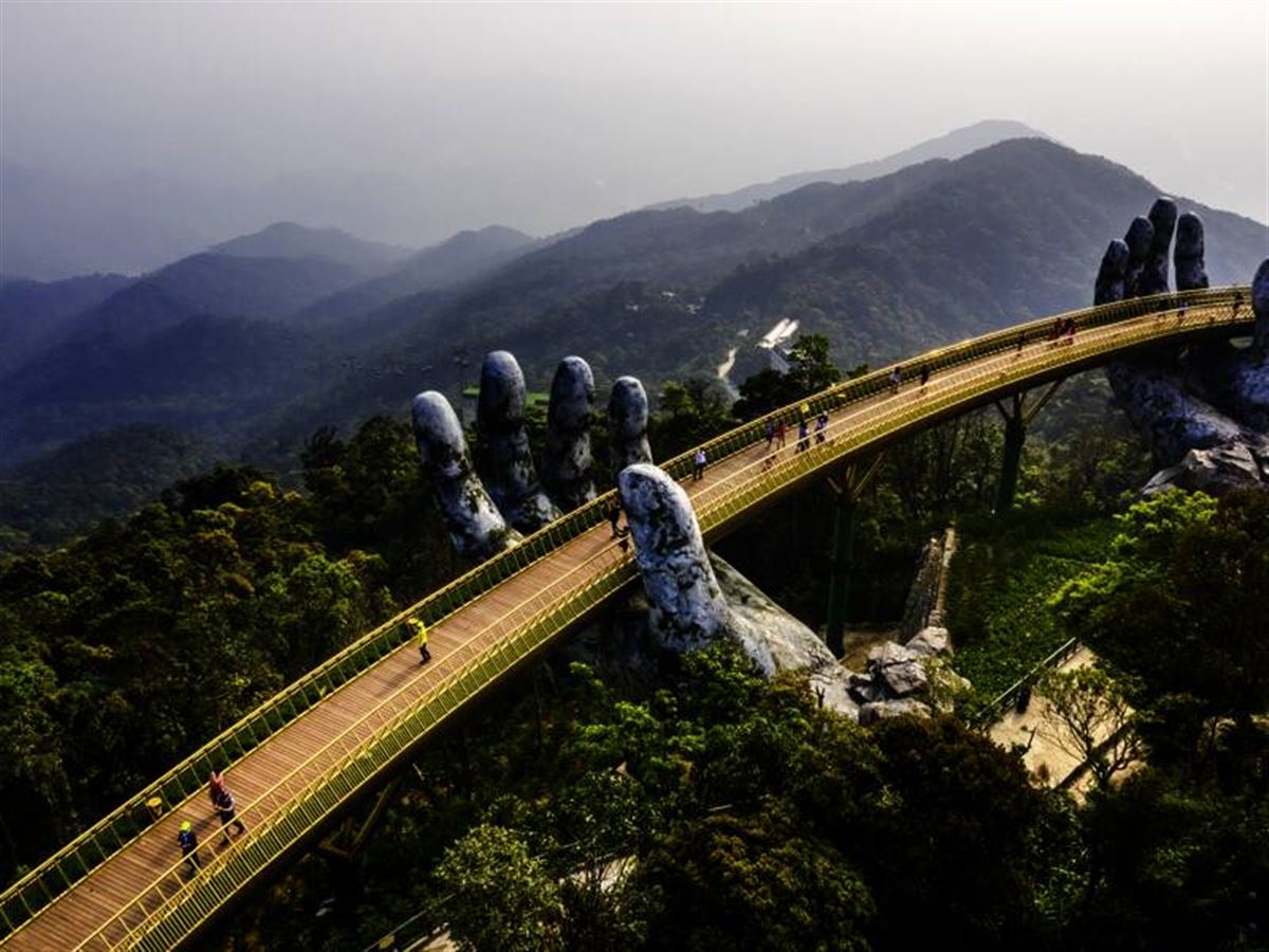 Landpartie: Eine der spektakulärsten Seilbahnen Asiens bringt uns zu den Ba Na Hills auf fast 1500 m. Sanft gleiten wir über dichten Wald und schroffe Felsen immer weiter hinauf und zücken oben angekommen die Kameras: Die Goldene Brücke ist der Instagram-Spot schlechthin! Getragen von zwei riesigen steinernen Händen bietet sie das perfekte Fotomotiv. Zurück in Hoi An lassen wir beim Abschiedsessen die Reise Revue passieren: Megastädte, Mekong, mystische Stätten, Meer - wir haben so viel gemeinsam erlebt!