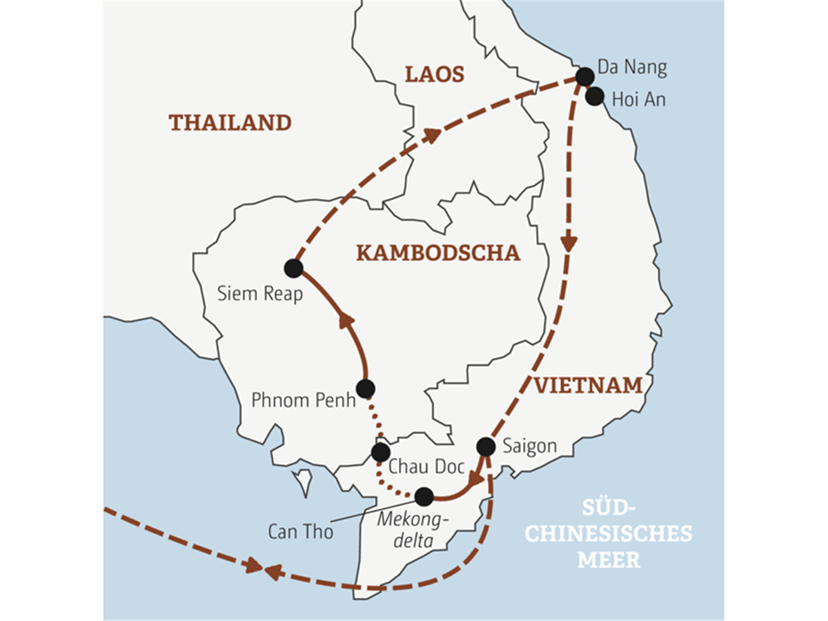 Den letzten Tag in Hoi An genießen wir je nach Gusto, bevor wir am Abend vom nahen Da Nang zurück nach Saigon fliegen. Nach einem Zwischenstopp von ca. zwei Stunden treten wir den Rückflug nach Frankfurt oder München an (Flugdauer ca. 12,5 Std.).