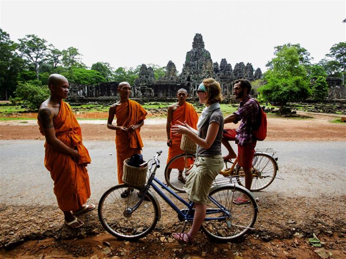 Dschungelbuch mal anders: Oben brüllen die Affen, unten strampeln wir - auf Fahrrädern bis zum Tempel Angkor Wat. Anhalten und zur Abwechslung mal klettern, über verwitterte Stufen und mächtige Mauern. Nächster Stopp: Den Tempel Ta Prohm hat die gigantische Würgefeige fest im Griff - die Umarmung ihrer Wurzeln sprengt die Mauern und hält sie zugleich zusammen. Wir steigen um auf Tuk-Tuks und schauen in versteinerte Mienen: Der Bayon-Tempel ist berühmt für seine lächelnden Riesengesichter. Chivans Abendtipp: Ein kulinarischer Streifzug über einen Nachtmarkt - von Fischsuppe bis Banana Pancake bleibt hier kein Wunsch offen.