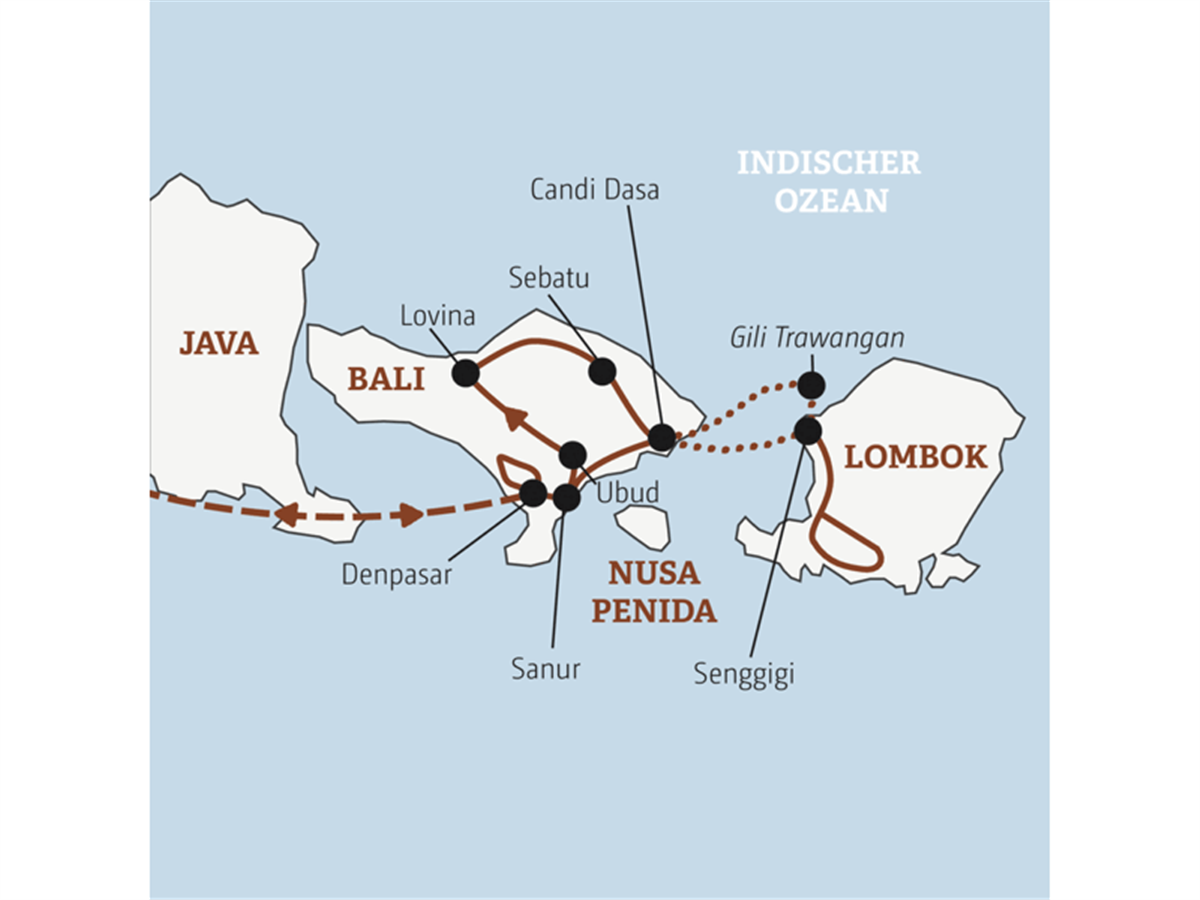 Vormittags per Boot und Bus nach Denpasar, dann Transfer zum Flughafen. Abends Flug mit Turkish Airlines nach Istanbul (Flugdauer ca. 13 Std.) oder nachts mit Qatar Airways nach Doha bzw. mit Emirates nach Dubai (Flugdauer je ca. 9,5 Std.).