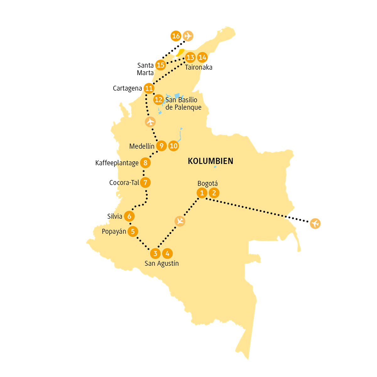 Der Koffer steht bereit, der Wellensittich ist bei der Nachbarin oder dem Nachbarn in Pflege, es geht los! Heute fliegst du nach Bogotá. Bei deiner Landung erwartet dich deine Reiseleitung, voller Vorfreude, dir die Heimat in den nächsten Wochen näherbringen zu dürfen. Du fährst in dein Hotel, wo du dich nach dem langen Flug ausruhen kannst. Zur Einstimmung auf Kolumbien triffst du dich abends zu einem Willkommensgetränk und typischem Fingerfood.