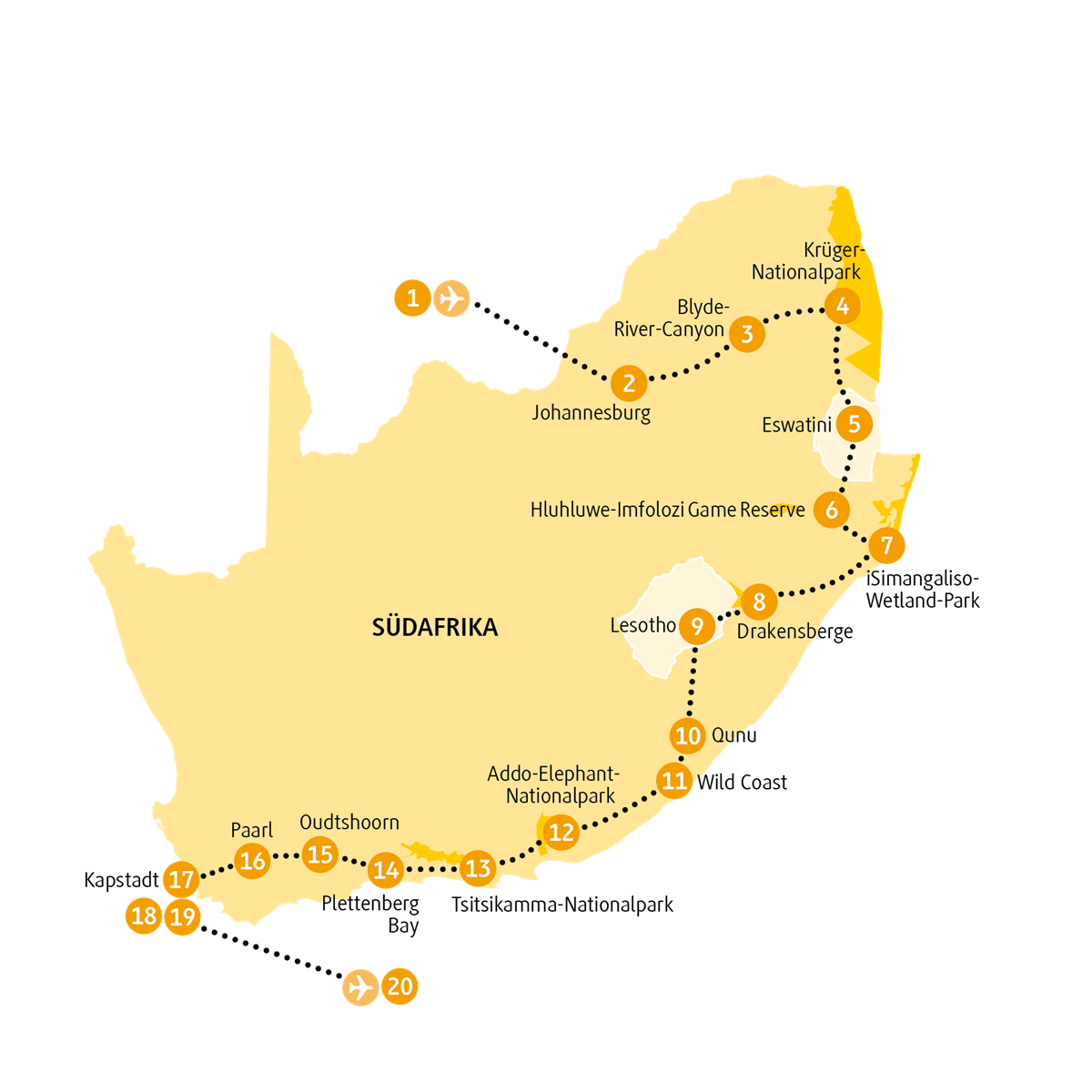 Die Fahrstrecke umfasst ca. 380 km zzgl. der Safari im Addo-Elephant-Nationalpark.