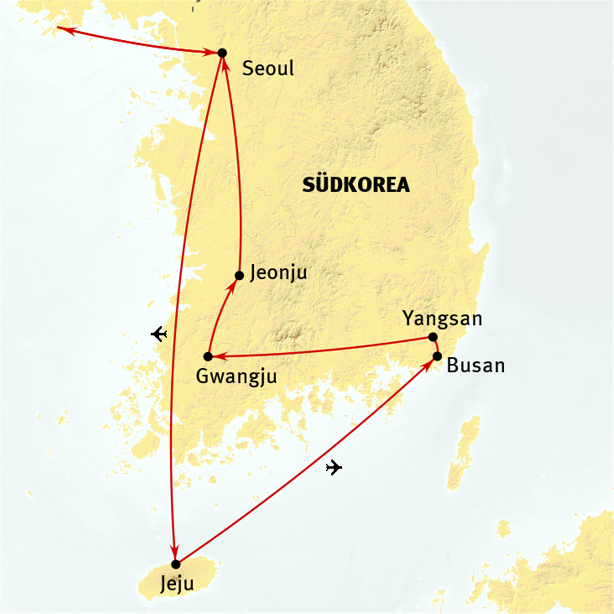 Erleben wir Südkorea auf einer unvergesslichen Rundreise: Von der pulsierenden Metropole Seoul über die Vulkaninsel Jeju bis zur Küstenstadt Busan erwarten uns Naturwunder, Strände, Märkte und Hafenflair. Spirituelle Orte wie Yangsan und das kulturelle Gwangju lassen uns in Kunst und Tradition eintauchen, während Jeonju mit Hanok-Architektur und kulinarischen Spezialitäten begeistert. Eine Reise voller Kontraste, Genuss und bleibender Eindrücke!