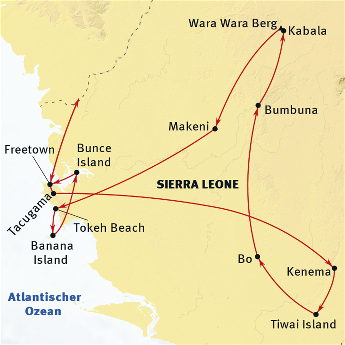 Flug in Eigenregie nach Freetown. Nach Ankunft Transfer zum Hotel.