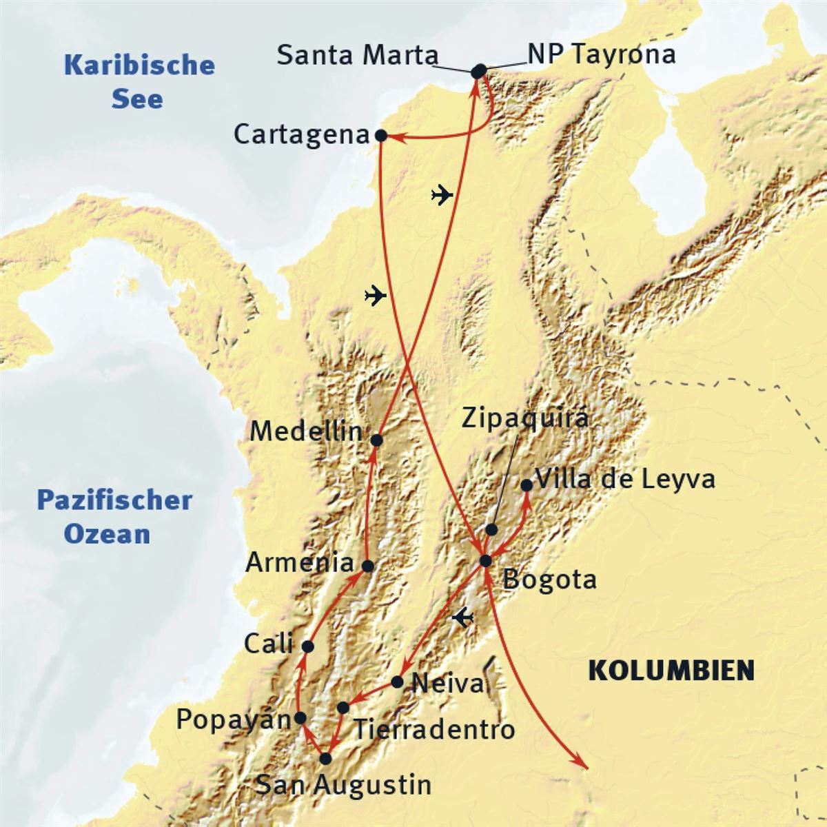 Von der grünen Bergwelt zur farbenfrohen afrokolumbianischen Karibik. Flug über Bogota nach Santa Marta. Am Nachmittag Stadtführung durch die älteste Stadt Kolumbiens.