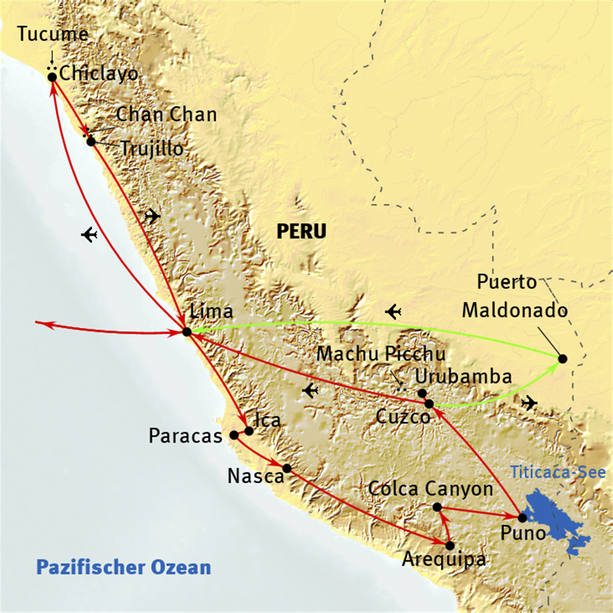 LimaNazcaArequipaPunoTaquile-InselCuzcoDas Heilige Tal der InkaPisacChiclayoTrujilloHuacachinaParacasPiscoAndahuaylillasOllantaytambo