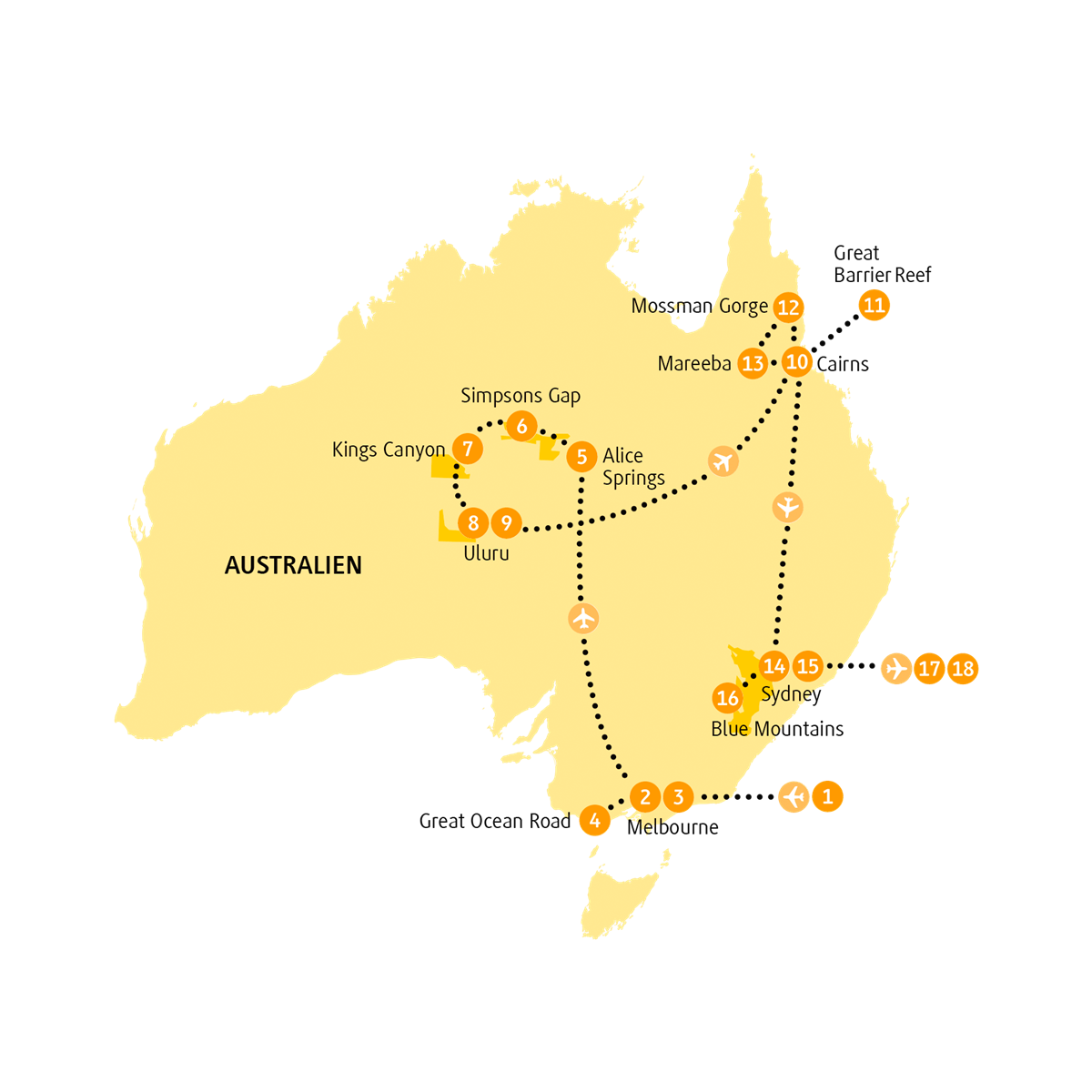 Die Fahrstrecke beträgt ca. 30 km. Der Flug von Melbourne nach Alice Springs dauert ca. 3 Stunden.