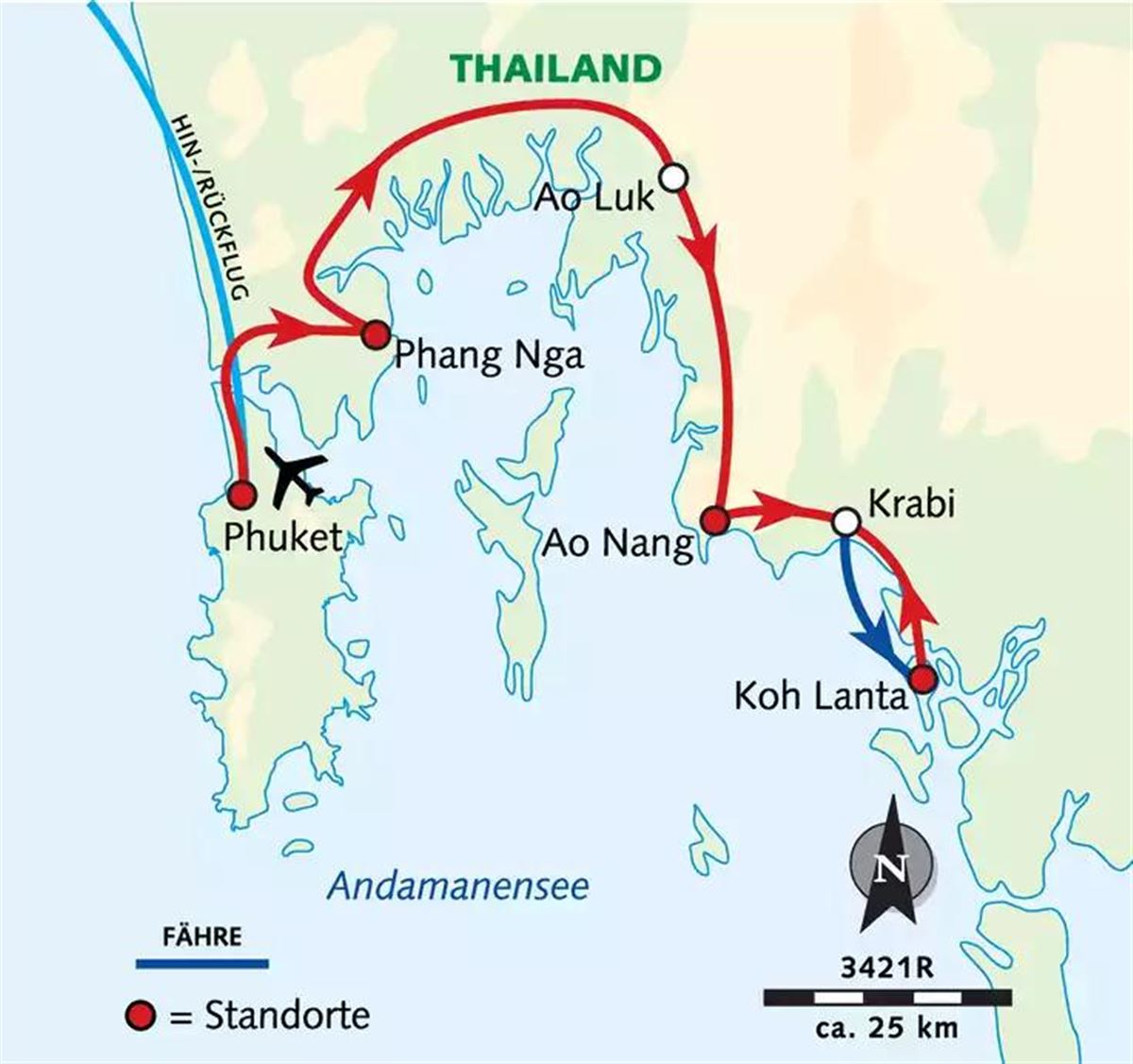 Transfer zum Tala-Strand, wo unsere erste Radtour beginnt. Kautschukplantagen, Palmen und kleine Dörfer säumen unseren Weg. Die Einheimischen winken uns Radlern überall fröhlich zu. Abwechslung bringen der Besuch des Gibbon-Rehabilitationsprojekts und der anschließende Spaziergang zum Bang-Pae-Wasserfall im tropischen Regenwald. Nach dem Mittagessen fahren wir weiter mit herrlichen Ausblicken auf die malerischen Küstenabschnitte der Ostküste. Bevor wir mit dem Kleinbus zum Hotel zurückkehren, besuchen wir den interessanten Phra-Thong-Tempel.