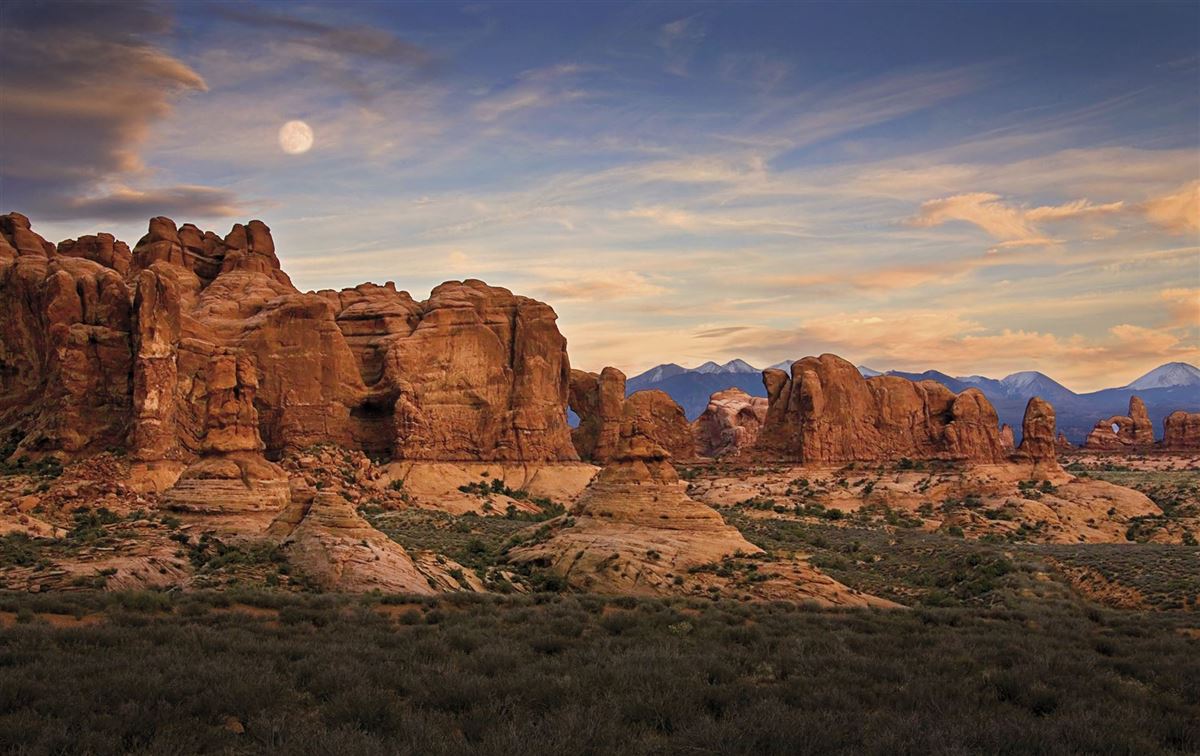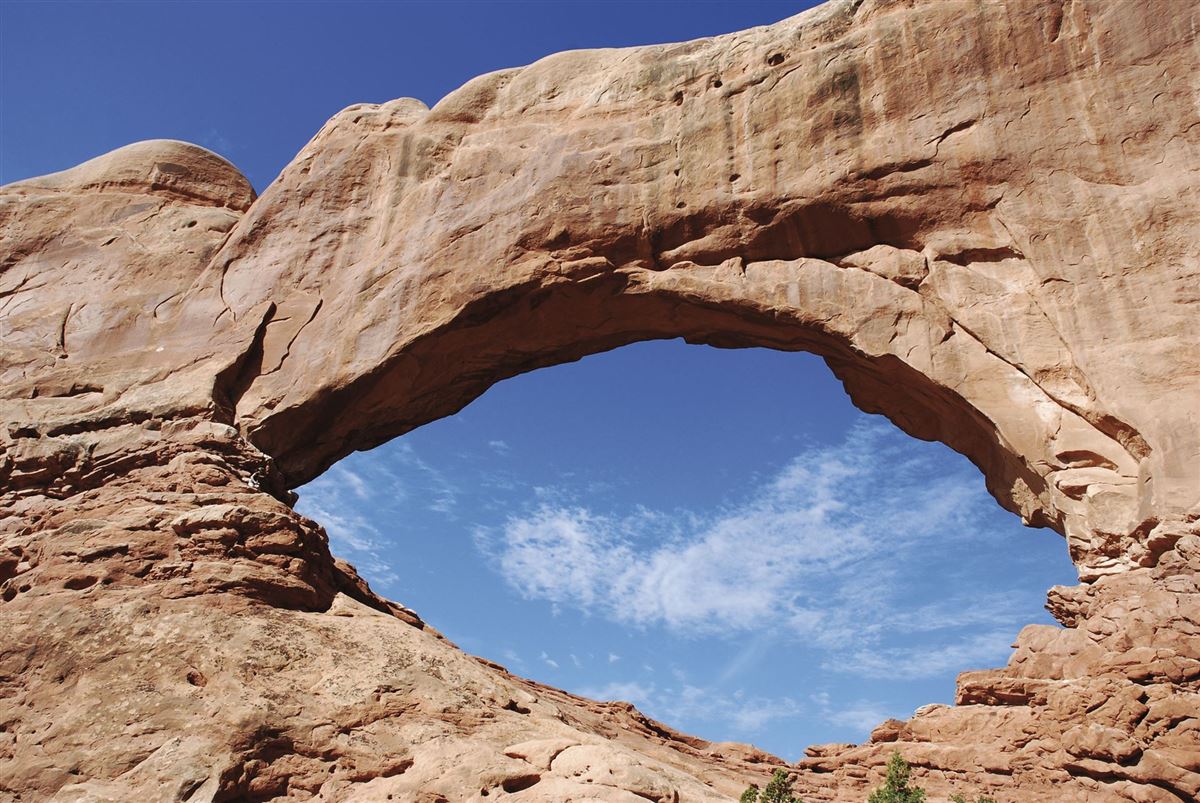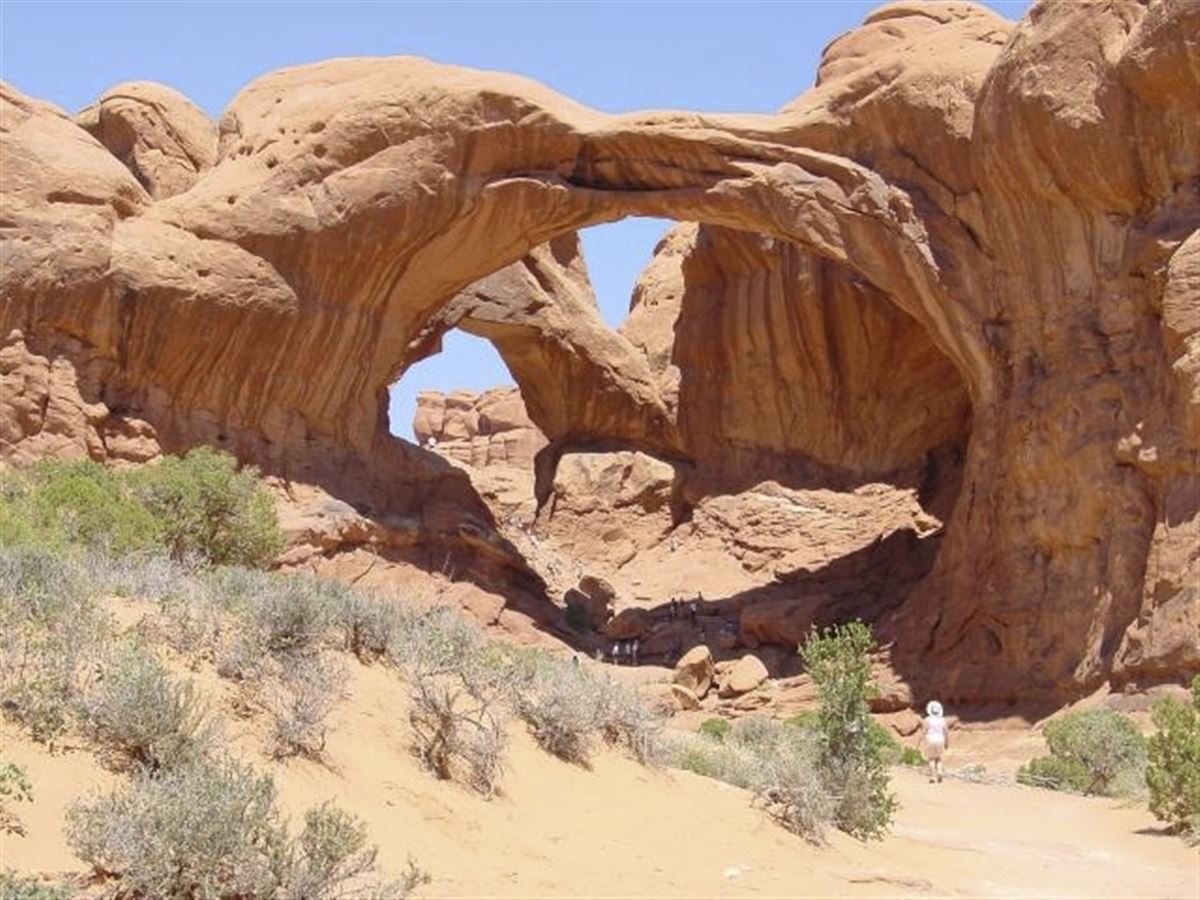 Ganztägige Tour durch den Arches-Nationalpark, mit einer Kurzwanderung am Delicate Arch, eine Fülle einzigartiger Bogenformationen aus rotem Sandstein, darunter im "Devils's Garden" der Landscape Arch, eine der größten Felsbrücken der Welt. In einem eleganten Schwung spannt sich ein etwa 90 m langes und schmales, zerbrechlich erscheinendes Felsband über die Erde.