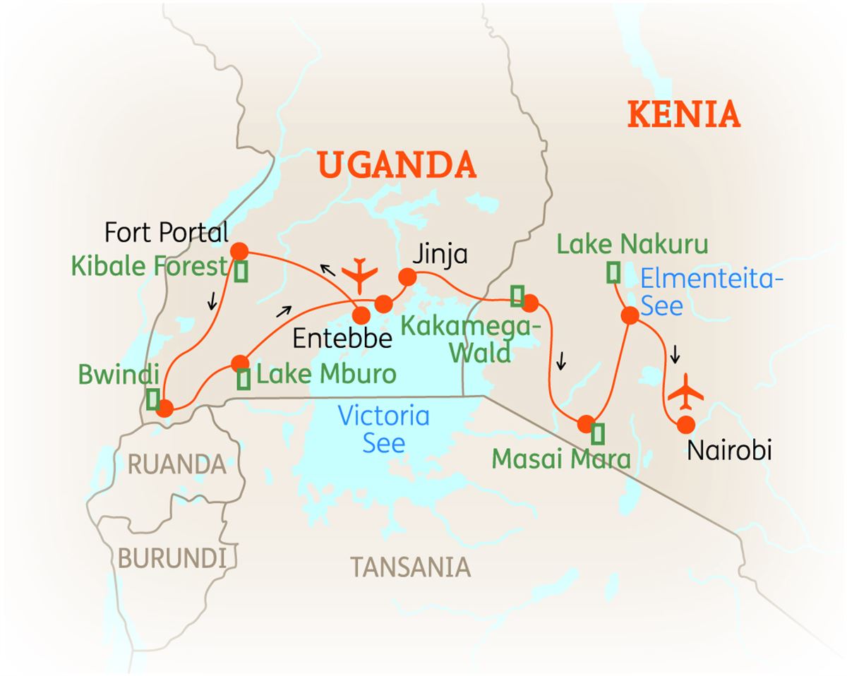 Nach dem Frühstück brechen Sie auf in Richtung kenianische Grenze. Sie verabschieden sich von Ihrer ugandischen Reiseleitung und nach den Einreiseformelitäten übernimmt die kenianische Reiseleitung. Es geht weiter zum Kakamega-Wald, wo Sie sich nach dem Check-In in Ihrer Unterkunft in dem weitläufigen Garten ein wenig die Beine vertreten können. 2 Nächte am Kakamega-Wald. (F/A)