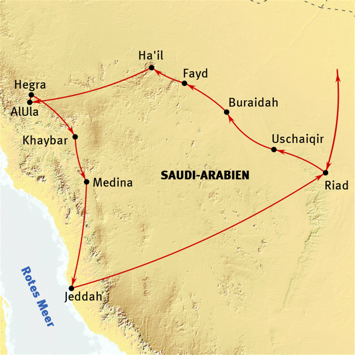 Saudi-Arabien modernisiert sich schnell und öffnet sich nach langer Abgeschlossenheit für Reisende. Die Reise führt von traditionellen Beduinendörfern zu modernen Metropolen wie Riad und zeigt beeindruckende Landschaften von Gebirgen bis zu weiten Wüsten und Lavafeldern. Höhepunkte sind UNESCO-Welterbestätten wie Hegra und Jubbah sowie die Küstenstadt Jeddah. Komfortabel reisen Sie im Bus mit deutschsprachiger Reiseleitung und erleben dabei die herzliche Gastfreundschaft der Saudis.