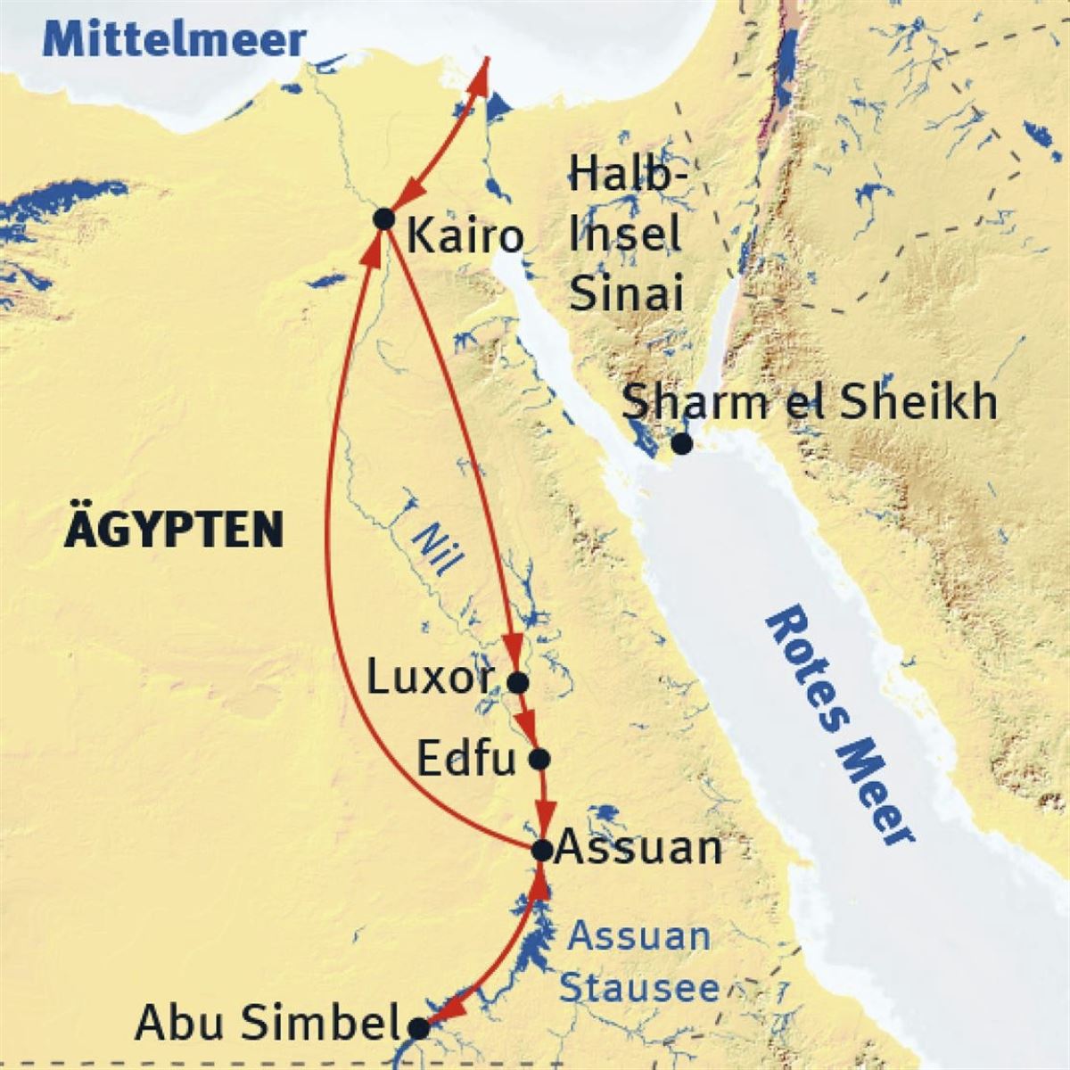 Der Vormittag steht zur freien Verfügung in Assuan. Alternativ frühmorgens halbtägiger Bus-Ausflug nach Abu Simbel (circa € 160,-). Hier im tiefsten Nubien, Besichtigung der nach dem Bau des neuen Hochdamms in einer aufwendigen "Rettungsaktion" verlegten Tempel des Ramses II. Darunter der Große Tempel mit der Fassade der vier Kolossalfiguren sowie der Nefertari-Tempel (ca. 560 km). Nachmittags kurzer Flug nach Kairo. Wir übernachten wieder im Hotel LE RIAD für zwei Nächte. (55 km)