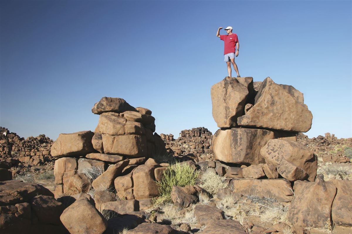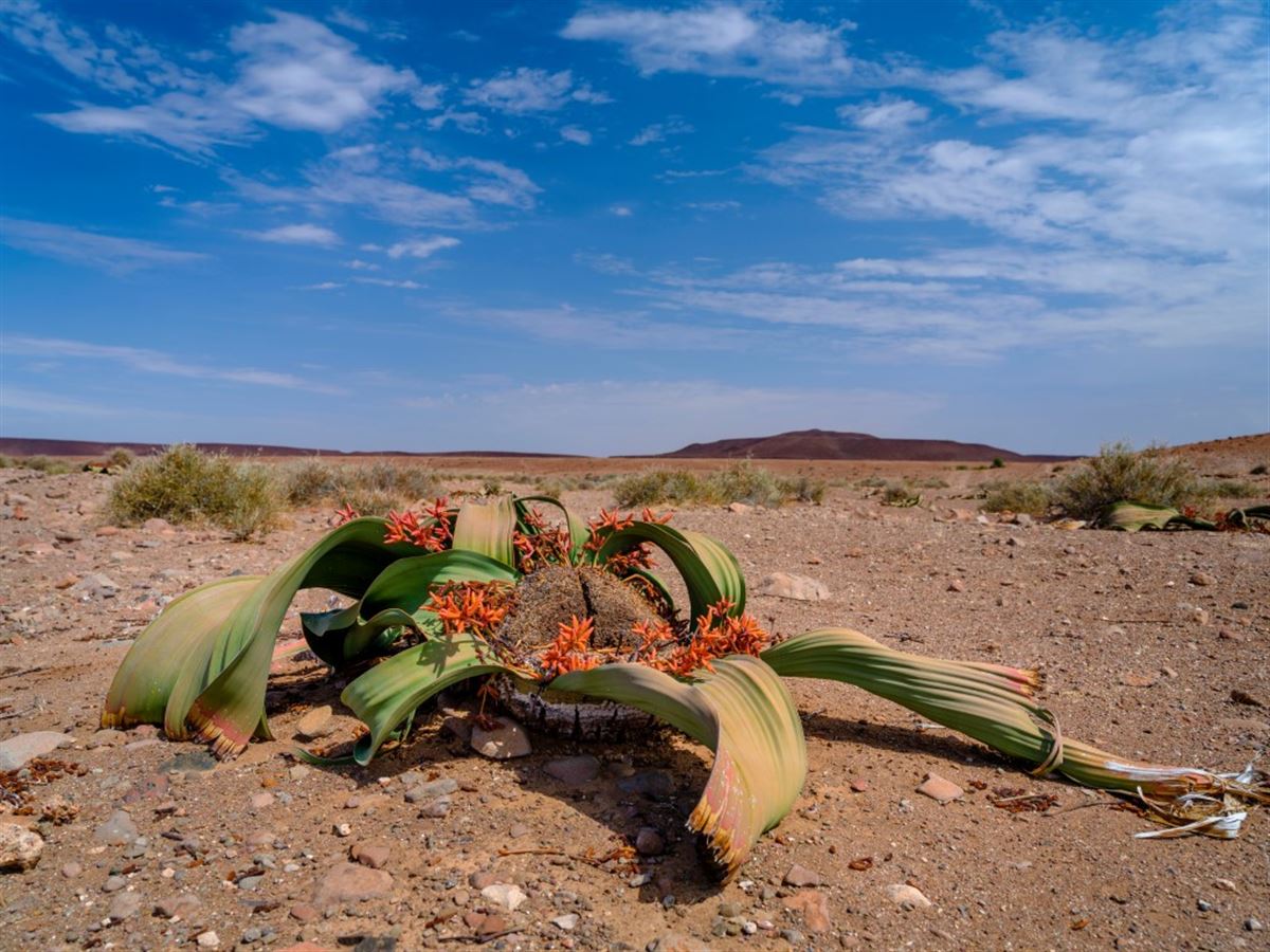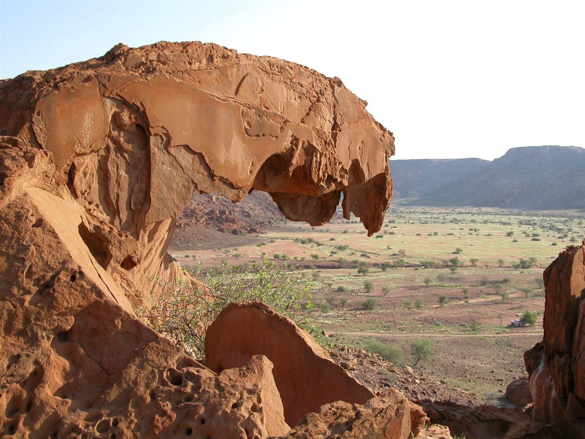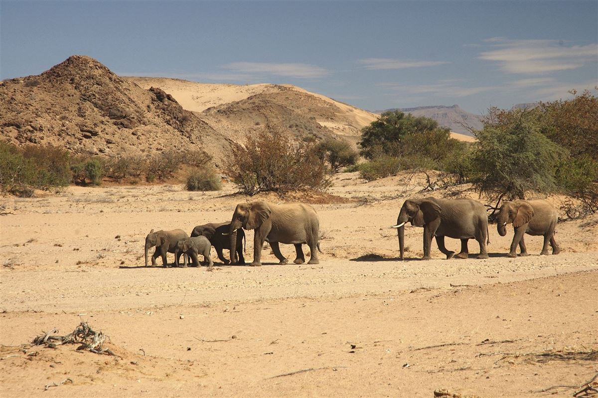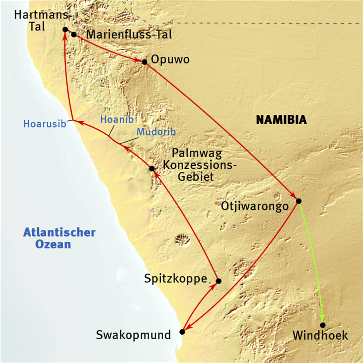 Der hier dargestellte Ablauf ist die geplante Route. Es gibt keine bestimmten Besuchs- oder Besichtigungspunkte. Wir sind unterwegs in unerschlossenen Regionen, fahren dorthin, wohin uns der Weg führt, halten an, wo es schön ist, wandern, besteigen kleine Hügel, sehen Höhlen und kuriose Felsformationen. Wir suchen wilde Tiere und treffen auf Einheimische, jedoch eher selten andere Touristen. Wir genießen einfach die Freiheit; die wilde, reizvolle Schönheit der Natur fasziniert, beeindruckt, überwältigt. Wir lassen dem Expeditionsleiter Freiraum, die Route bei Notwendigkeit zu ändern. Ein vorgereistes Serviceteam legt fest, wo wir übernachten, sucht dafür die schönsten Stellen und baut für uns das Lager auf- und wieder ab. Einige frühe Abfahrten, manchmal erreichen wir das Lager erst spätnachmittags, am Tagesende - immer mit knisterndem Lagerfeuer und kaltem Bier.Zu Anfang der Inselberg Spitzkoppe, unfassbare 700 Mio.-Jahre alt. Die höchste Erhebung wird Namibias Matterhorn genannt. Hier finden sich Felsmalereien und markante Felsformationen. Es folgen die unendlichen Weiten der Damaraland-Felswüste, keine ausgewiesenen Pisten, keine Zivilisation, weit und breit wohl nur wir. Wir suchen Xai-Ais auf, eine geheime Quelle, die Wildtiere anzieht. Überreste von Steinhaufen lassen vermuten, dass sie einstige Behausungen der damaligen berittenen deutsch-südwestafrikanischen Polizei waren, die hier während der Wüstenpatrouillen mit Kamelen ihren Rastplatz hatten. Wir ziehen weiter durch die riesige Wildnis, die Palmwag-Konzession, ein kommunales Schutzgebiet, welches die benachbarte Bevölkerung der Natur und den Tieren überließ. Basaltgestein mit seltenen Aloen und giftigen Euphorbien, Kegel- und Tafelberge sowie wilde Schluchten prägen das urzeitliche Rückzugsgebiet von Wüstenlöwen, Spitzmaulnashörnern und Elefanten. Wir versuchen, sie aufzufinden. Im Mudorib-Canyon zwei Übernachtungen. Ein Tagesausflug in das sandige Hoanib-Flussbett, ein saisonaler Trockenfluss, seitlich begrenzt durch Berge und Dünen, ein Flusstal mit Oasencharakter. Savanne mit Mopane-, Ana- und Kameldornbäumen sowie hochwachsende Gräser und Schilf in den feuchten Zonen bieten den Wüstenelefanten ein optimales Lebensumfeld. Sicherlich ein erlebnisreicher Tag. Unser Weg führt uns weiter nach Hoarusib, ein Trockenflussbett mit Kalksteinformationen, in Ufernähe "Lehmburgen", Tonformationen geformt aus Ablagerungen und Erosionen sowie Kalksteinhöhlen. Das Wasser des Flusses, wenn er fließt, strömt durch einen engen Canyon. Hier wachsen Makalani-Palmen aus den hierher gespülten Früchten. Unterwegs sehen wir lebensgroße "Steinmänner", große Skulpturen aus Steinen mit Draht zusammengehalten, die ein anonymer Künstler hier platziert hat. Niemand weiß, wer er ist. Die stummen Gestalten regen Sinne an und sorgen für Gesprächsstoff. Irgendwann erreichen wir Hartmans Valley, benannt nach seinem Erkunder. Das Gebiet erstreckt sich von Süd nach Nord, fällt dann abrupt in das Kunene-Flussbett ab. Der Blick von der Abbruchkante ist fantastisch, wir sehen Dünen, schroffe Berge und den Grüngürtel am Flussbett des Kunene. Ein einzigartiges Fleckchen Erde. Das Wetter kann hier dramatisch wechseln, denn der atlantische Küstennebel zieht bis hierher, die frühmorgendlichen Nebelschwaden verbreiten eine gewisse Unheimlichkeit. Tiefsandpisten bringen uns in das Tal des Marienflusses, welches sich bis ganz in den Norden, bis zur Grenze des Nachbarlandes Angola erstreckt. Hier fließt der Kunene-Grenzfluss. Im ausgedehnten Tal die Weidegründe von Rindern und Schafen der halbnomadischen Himba, die korrekt eigentlich Ovahimba heißen und denen wir hier im Nordwesten immer wieder begegnen. Ihre Lebensart weitestgehend unberührt von westlicher Zivilisation mit einzigartigen Bräuchen und Traditionen, für uns wohl eher befremdlich. Die Haut wird mit Ocker gefärbtem Fett eingerieben, die Haare besonders kunstvoll geflochten. Selbstgemachter Schmuck aus Draht, Leder, Perlen und Muscheln verschönern beide Geschlechter. Auch das Wildleben beeindruckt, hier schleichen Leopard und Gepard umher, Giraffen, Springböcke, Strauße und Bergzebras grasen im Tal, im Fluss leben große Krokodile. In dieser Region finden sich auch die Feenkreise, ein bislang ungeklärtes Phänomen. Die mysteriösen Kreise inmitten der Landschaft sind kahle, vegetationslose Stellen, von kräftigen Grasbüscheln umwachsen. Bis heute sind sich Forscher nicht einig, was zu dieser, sich selbst erhaltenden Erscheinung, führt. Wir fahren im Tal umher, sehen die landschaftlich schönen Epupa-Fälle.