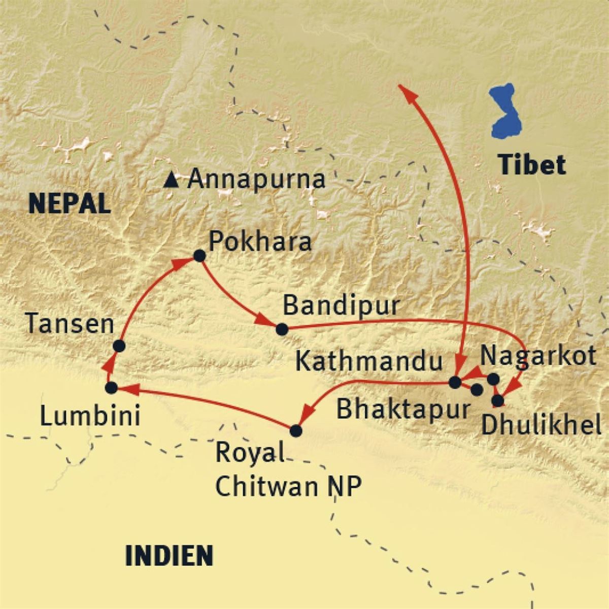 Von Kathmandu aus Fahrt zunächst nach Osten auf dem Prithvi Highway bis Mugling. Ein Großteil der Strecke führt entlang des Trisuli-Flusses. Von dort zweigt die Straße ab in den Süden Nepals, zum Royal Chitwan-Nationalpark, dem letzten verbliebenen Stück Dschungel an der Grenze zu Indien. Obwohl der Park nicht mit den offenen Steppen afrikanischer Nationalparks zu vergleichen ist, wird er von vielen Besuchern gleichermaßen geschätzt (167 km, ca. 5 Std.).