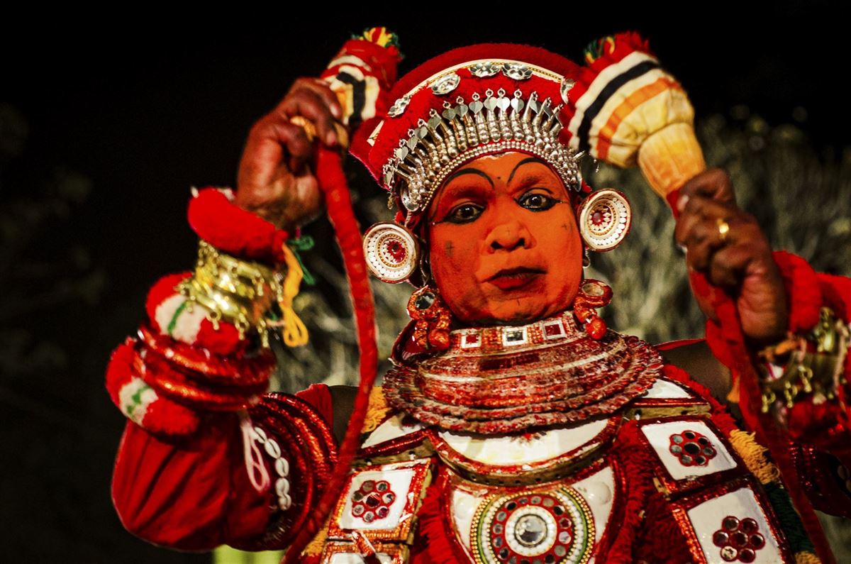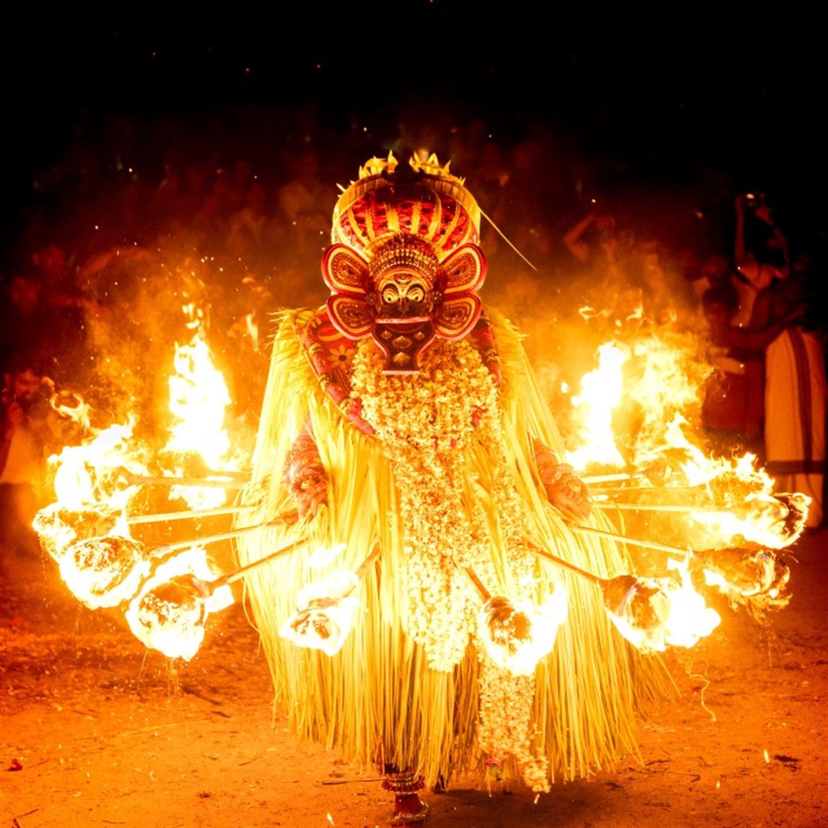 Theyyam oder Theyyaattam ist eine Form der Heldenverehrung in Nord-Kerala. Es handelt sich um ein Ritual und eine Volkstanzform, die durch eine umfangreiche Literatur von Volksliedern unterstützt wird. „Theyyam“ ist eine Verballhornung des Gottes Deyvam. „Aattam“ bedeutet Tanz. „Theyyaattam" bedeutet also "Tanz des Gottes". Die Person, die die Gottheit spielt und verkörpert, wird allgemein „Kolam" genannt. Das Wort „Kolam“ bedeutet in Tamil und Malayalam Figur, Gestalt oder Make-up. Am Morgen können wir uns von der langen Nacht erholen und tagsüber einige der Rituale miterleben. Oder wir entspannen am Strand oder erkunden einige der nahen gelegenen Fischerdörfer. Am späten Abend besuchen wir erneut den Tanz im örtlichen Tempel.