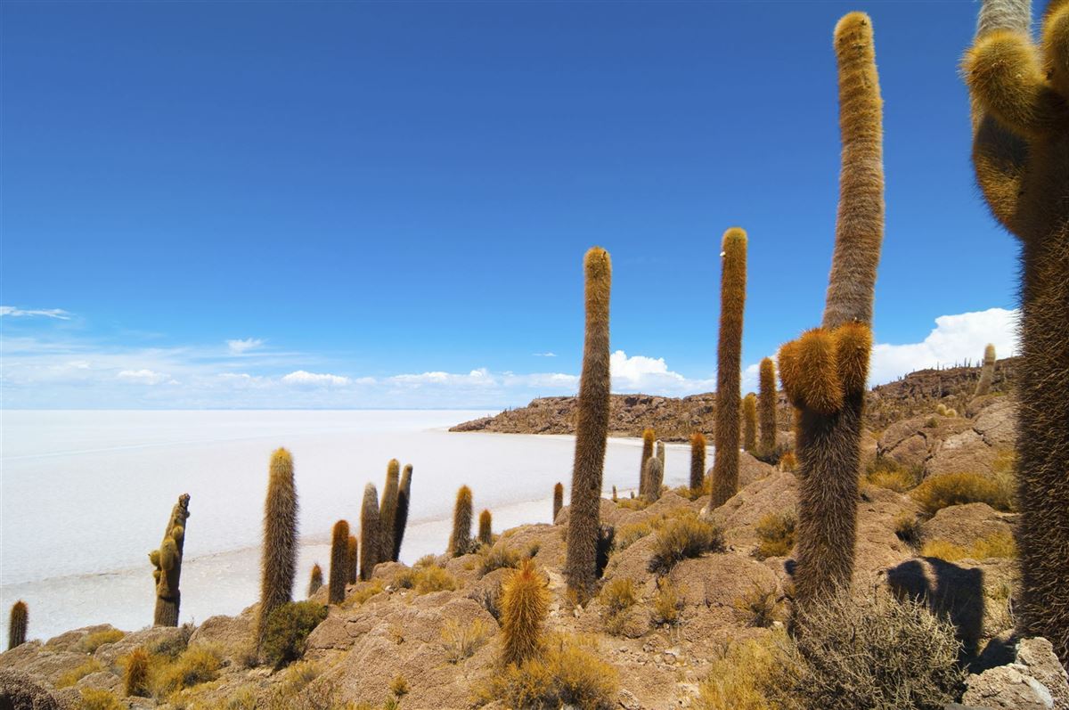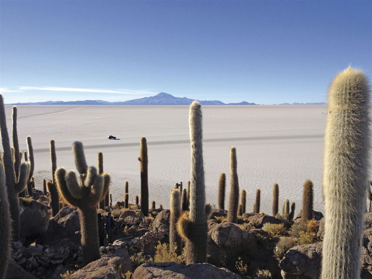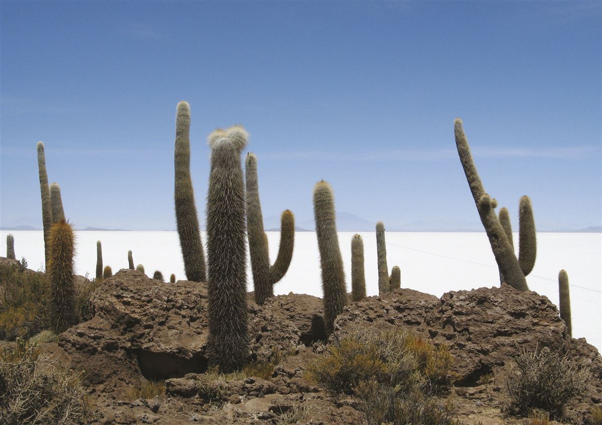 Spektakulärer Tag auf dem Salar de Uyuni: Zunächst Besuch einer Salz-Manufaktur, dann Fahrt zu den Mumien von Coquesa, an den Flanken des mächtigen Tunupa-Vulkans gelegen, mit fantastischem Blick über den Salar. Fahrt über den See und Besuch der "Isla Incahuasi", einer Insel inmitten der großen Salzpfanne. Riesige Kakteen, einzigartige Vegetationsformen, eine surreale Szenerie in einem weißen Meer aus Salz. Nach dem Sonnenuntergang auf dem Salar Rückfahrt nach Uyuni.