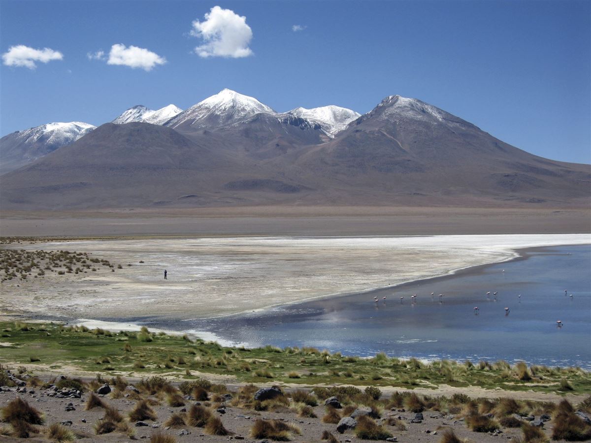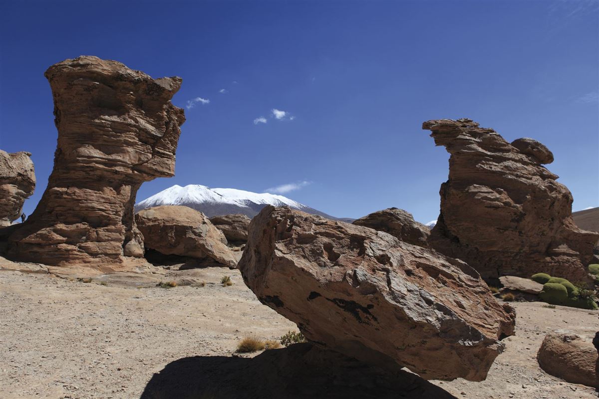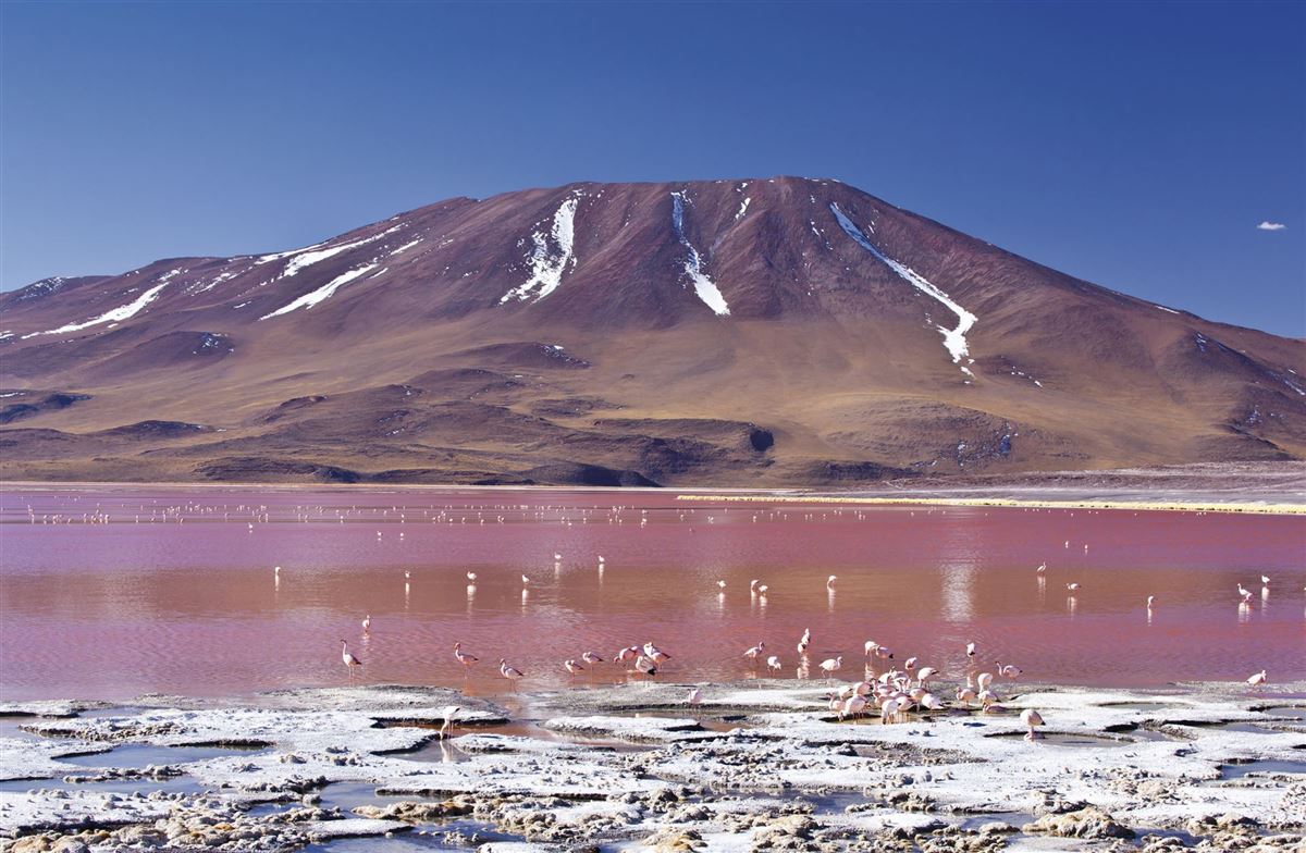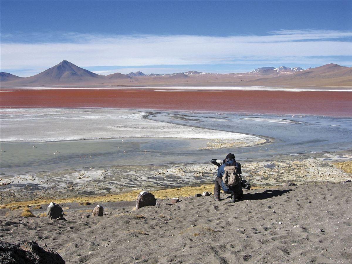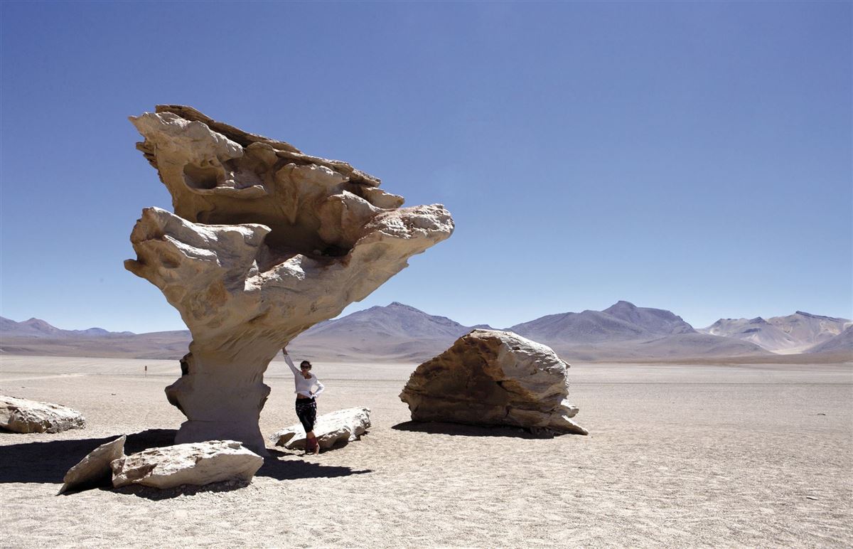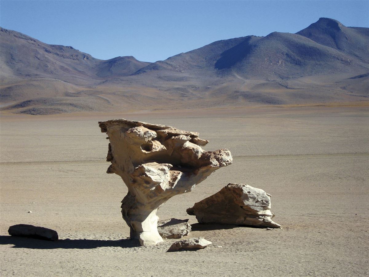 Fahrt vorbei am "Arbol de Piedra", einer von Erosion geschaffenen Steinskulptur, zur Laguna Colorada mit ihrem rötlich schimmernden Wasser. Anschl. zum Geysirfeld Sol de Mañana mit zischenden Fontänen und blubbernden Erdlöchern auf 5.000m Höhe. Weiter durch den Salar de Chaviri und durch die Dali-Wüste zur Laguna Verde am Fuß des Licancabur-Vulkans. Abends zurück über Uyuni nach Colchani. Übernachtung in einem ganz aus Salz gebauten Hotel.