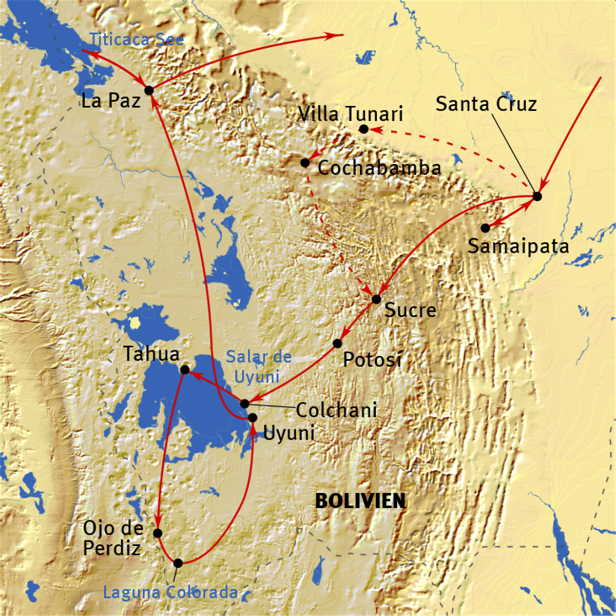 Abends Abflug von Deutschland. Linienflug über Madrid nach Santa Cruz de la Sierra.