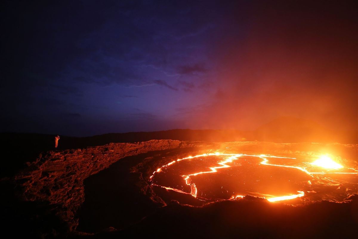 Nach dem Abbau des Zeltcamps beginnt die Offroad-Fahrt in Richtung Erta-Ale-Vulkan. Gegen Mittag erreichen Sie Dodom, wo mit den Afar-Autoritäten die letzten Formalitäten für den Besuch des Feuerberges erledigt werden. Danach fahren Sie weiter zum neuen Erta-Ale-Basislager, das sich unweit des Kraterrandes befindet. Mit der einsetzenden Dunkelheit steigen Sie in die Caldera des Erta Ale ab und nähern sich dem offenen Schlund. Hier bietet sich Ihnen ein Naturschauspiel ohnegleichen und Sie haben genügend Zeit das urzeitliche Spektakel auf sich wirken zu lassen. Übernachtung in einfacher Steinhütte der Afar. (Gehzeit ca. 30 min – 1h, 50 m?; Fahrzeit ca. 2h, 70km).