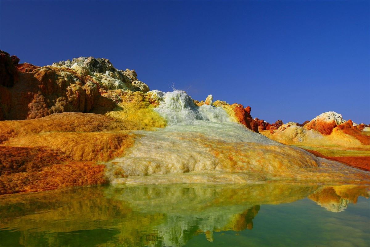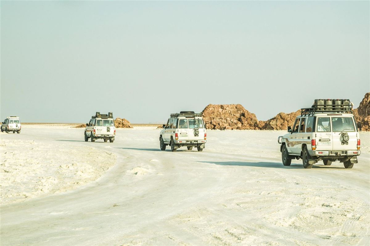 Heute geht es zunächst zurück nach Semera und nachdem bei der Regionalverwaltung alle Papiere für Ihre Danakil-Expedition entgegen genommen sind, fahren Sie weiter in einen der faszinierendsten Landstriche der Erde. Die Danakil-Senke, ca. 135 m unter dem Meeresspiegel, gilt als vulkanisch aktivste Gegend der Welt. Am späten Nachmittag erreichen Sie den salzhaltigen Afrera-See, der von über 200 sprudelnden Quellen gespeist wird. Nutzen Sie die Gelegenheit für ein schwereloses Bad im See. Übernachtung im Zelt. (Fahrzeit ca. 6h, 320 km).