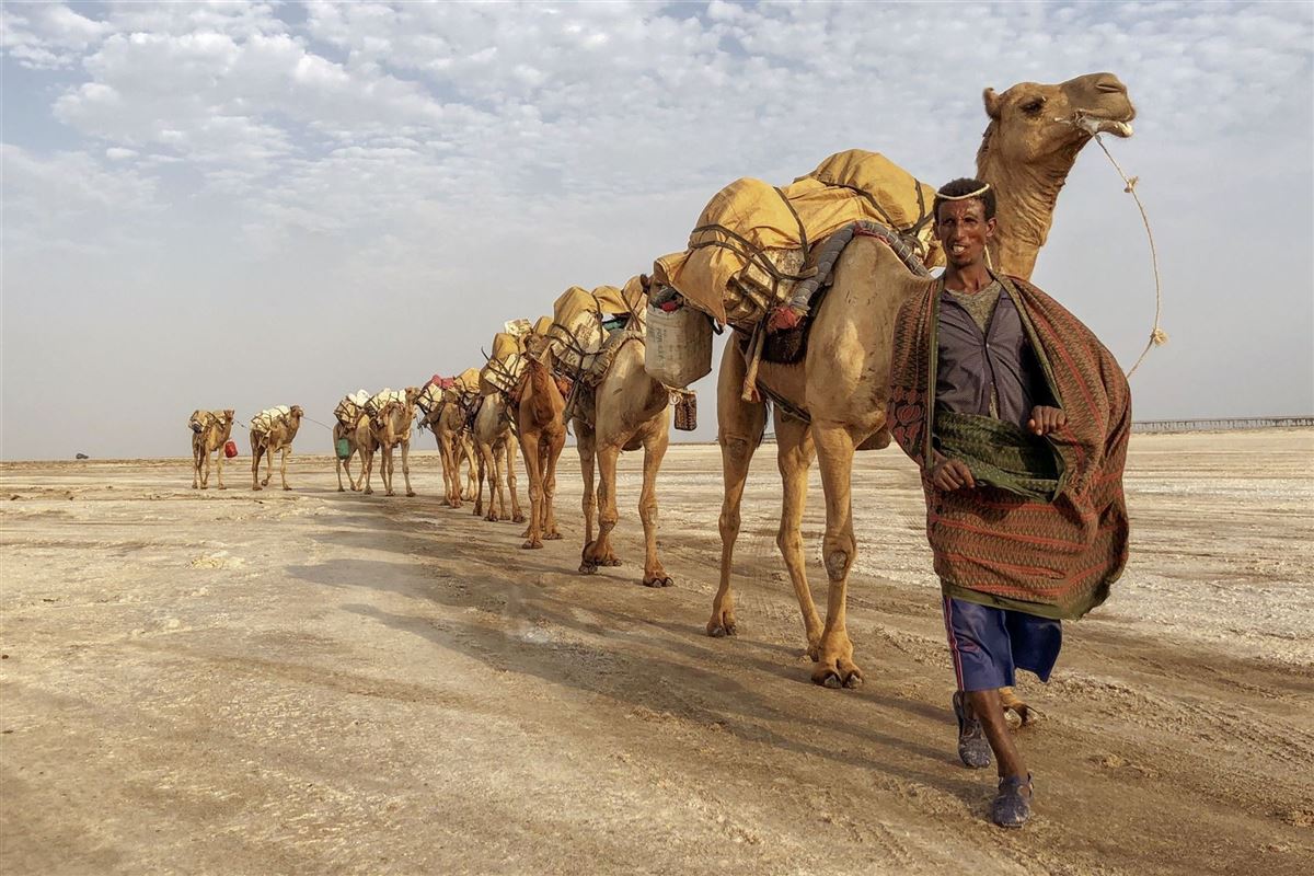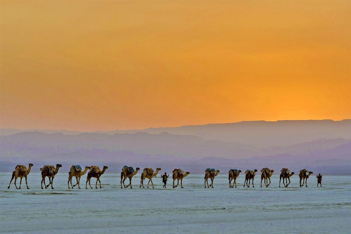 Im Morgengrauen haben Sie noch einmal die Möglichkeit das überwältigende Naturschauspiel zu erleben. Anschließend genießen Sie frischen Kaffee und ein ausgiebiges Frühstück im Camp, verstauen das Equipment in den Fahrzeugen und fahren weiter Richtung Norden querfeldein durch die Danakil nach Hamed Ela. Die kleine Salzstemmer-Siedlung wirkt wie ein Außenposten der Zivilisation, dessen „weißes Gold“ zahlreiche junge Männer lockt. Übernachtung im Zelt. (Gehzeit ca. 2-3h, 500 m?; Fahrzeit ca. 2-3h; 80 km).