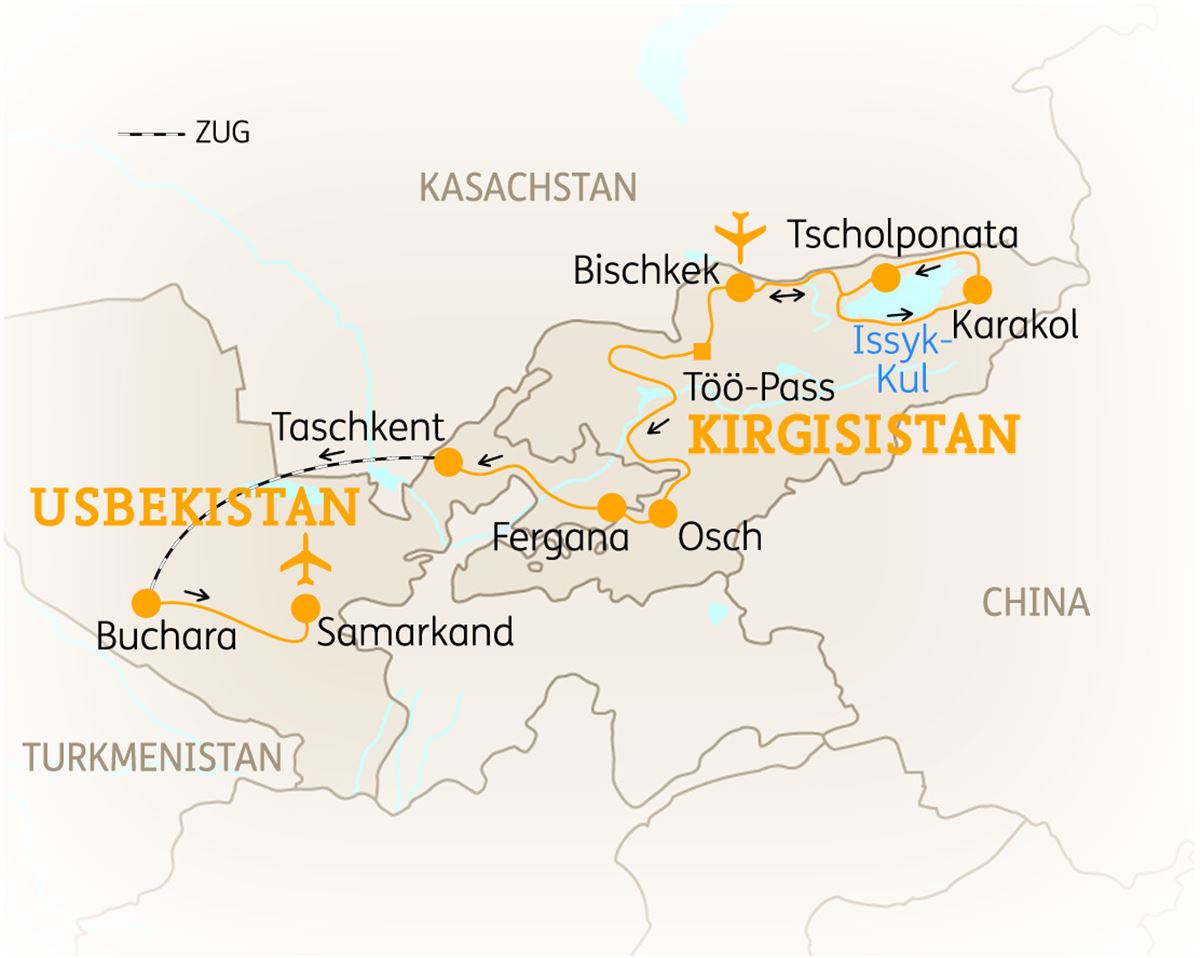 Nach Ihrer Ankunft am Flughafen und einem ersten Kennenlernen erwartet Sie ein Stadtrundgang, bei dem Ihre Reiseleitung Ihnen die Höhepunkte der Stadt zeigt. Breite Straßen, große Parks und sowjetische Monumentalbauten prägen das Stadtbild. Am Nachmittag schlendern Sie über den, während der Sowjetzeit eröffneten Osch-Basar, auf dem Sie die Möglichkeit haben, Gewürze oder Kunsthandwerke zu erwerben. 1 Nacht in Bischkek. (F/A)