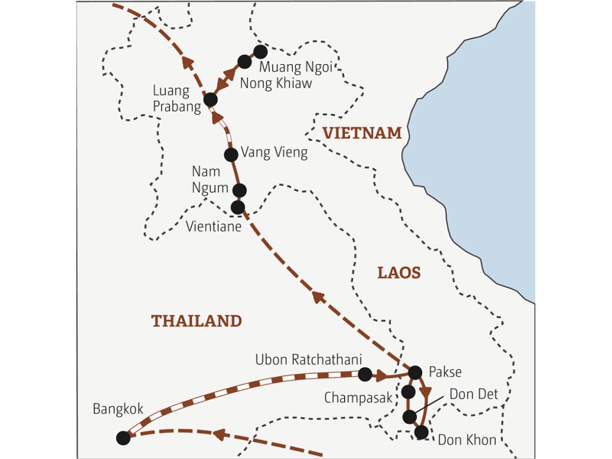 Getöse am Morgen: Bei den Khone-Phapheng-Fällen donnern Millionen Liter Wasser über Felskaskaden. Weiter mit dem Bus nach Champasak und auf die Insel Don Daeng. Ankommen, unseren Homestay beziehen und solo das Dorf erkunden. Gemeinsamer Ausklang am Strand: Local Food, Holiday-Mood, Füße im Sand, Drink in der Hand. So geht Urlaub!