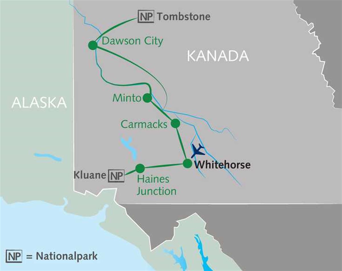Der einzige lange Fahrtag unserer Reise bringt uns zurück in die Zivilisation. Über den berühmten Klondike Highway erreichen wir am Nachmittag Whitehorse, die Hauptstadt des Yukon. Der Highway verläuft parallel zu genau der Route, die 1898 zur Zeit des großen Goldrausches so stark frequentiert wurde. Natürlich machen wir unterwegs Fotostopps und vertreten uns auch die Beine. Zum Beispiel bei den Five Finger Rapids: die "Finger" sind Stromschnellen, die von Felssäulen aus Basalt im mächtigen Fluss erzeugt werden. Später, nach Ankunft in Whitehorse, steht uns der Rest des Tages zur freien Verfügung. Hotelübernachtung in Whitehorse. 595 km.