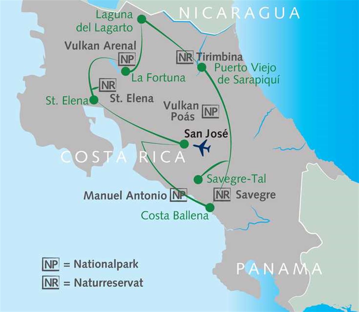 Nicht weit vom Vulkan Arenal gen Norden windet sich der Río Frío, der „kalte Fluss“, durch die tropisch grüne Vegetation des Caño-Negro-Reservats bis zum großen Nicaragua-See im Nachbarland. Hier, im wichtigsten Feuchtgebiet Costa Ricas sind zahlreiche, zum Teil seltene Tier- und Pflanzenarten beheimatet, die auf einen wasserreichen Lebensraum angewiesen sind. Durch die malerische Flusslandschaft unternehmen wir heute einen Bootsausflug und versuchen, der reichen Tierwelt so nah wie möglich zu kommen – unsere Chancen dafür stehen gut. 220 km.